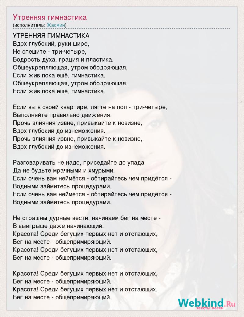 УТРЕННЯЯ ГИМНАСТИКА Вдох глубокий, руки шире, Не спешите - три-четыре, Бодрость духа, грация и пластика. Общеукрепляющая, утром ободряющая, Если жив пока ещё, гимнастика. Общеукрепляющая, утром ободряющая, Если жив пока ещё, гимнастика. Если вы в своей квартире, лягте на пол - три-четыре, Выполняйте правильно движения. Прочь влияния извне, привыкайте к новизне, Вдох глубокий до изнеможения. Прочь влияния извне, привыкайте к новизне, Вдох глубокий до изнеможения. Разговаривать не надо, приседайте до упада Да не будьте мрачными и хмурыми. Если очень вам неймётся - обтирайтесь чем придётся - Водными займитесь процедурами. Если очень вам неймётся - обтирайтесь чем придётся - Водными займитесь процедурами. Не страшны дурные вести, начинаем бег на месте - В выигрыше даже начинающий. Красота! Среди бегущих первых нет и отстающих, Бег на месте - общепримиряющий. Красота! Среди бегущих первых нет и отстающих, Бег на месте - общепримиряющий. Красота! Среди бегущих первых нет и отстающих, Бег на месте - общепримиряющий. Красота! Среди бегущих первых нет и отстающих, Бег на месте - общепримиряющий.