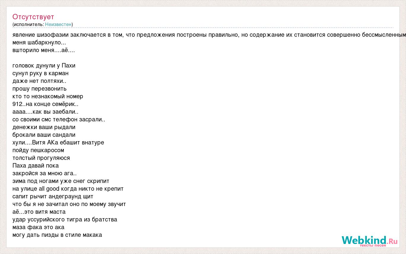 явление шизофазии заключается в том, что предложения построены правильно, но содержание их становится совершенно бессмысленным меня шабаркнуло... вшторило меня....аё.... головок дунули у Пахи сунул руку в карман даже нет полтяхи.. прошу перезвонить кто то незнакомый номер 912..на конце семёрик.. аааа....как вы заебали.. со своими смс телефон засрали.. денежки ваши рыдали брокали ваши сандали хули....Витя АКа ебашит внатуре пойду пешкаросом толстый прогуляюся Паха давай пока закройся за мною ага.. зима под ногами уже снег скрипит на улице all good когда никто не крепит сапит рычит андеграунд щит что бы я не зачитал оно по моему звучит аё...это витя маста удар уссурийского тигра из братства маза фака это ака могу дать пизды в стиле макака