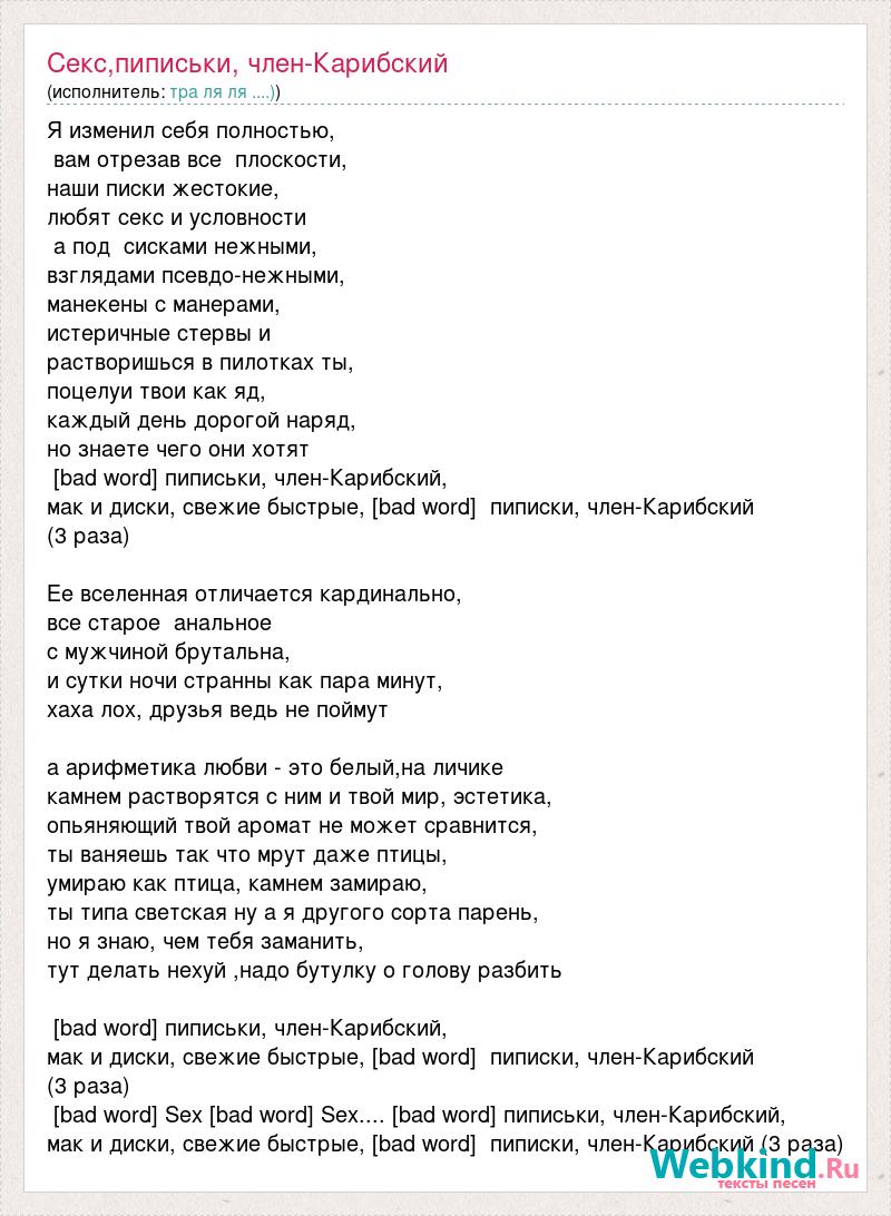Я изменил себя полностью, вам отрезав все плоскости, наши писки жестокие, любят секс и условности а под сисками нежными, взглядами псевдо-нежными, манекены с манерами, истеричные стервы и растворишься в пилотках ты, поцелуи твои как яд, каждый день дорогой наряд, но знаете чего они хотят [bad word] пиписьки, член-Карибский, мак и диски, свежие быстрые, [bad word] пиписки, член-Карибский (3 раза) Ее вселенная отличается кардинально, все старое анальное с мужчиной брутальна, и сутки ночи странны как пара минут, хаха лох, друзья ведь не поймут а арифметика любви - это белый,на личике камнем растворятся с ним и твой мир, эстетика, опьяняющий твой аромат не может сравнится, ты ваняешь так что мрут даже птицы, умираю как птица, камнем замираю, ты типа светская ну а я другого сорта парень, но я знаю, чем тебя заманить, тут делать нехуй ,надо бутулку о голову разбить [bad word] пиписьки, член-Карибский, мак и диски, свежие быстрые, [bad word] пиписки, член-Карибский (3 раза) [bad word] Sex [bad word] Sex.... [bad word] пиписьки, член-Карибский, мак и диски, свежие быстрые, [bad word] пиписки, член-Карибский (3 раза)