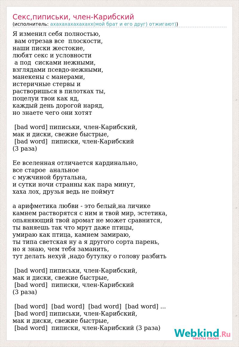 Я изменил себя полностью, вам отрезав все плоскости, наши писки жестокие, любят секс и условности а под сисками нежными, взглядами псевдо-нежными, манекены с манерами, истеричные стервы и растворишься в пилотках ты, поцелуи твои как яд, каждый день дорогой наряд, но знаете чего они хотят [bad word] пиписьки, член-Карибский, мак и диски, свежие быстрые, [bad word] пиписки, член-Карибский (3 раза) Ее вселенная отличается кардинально, все старое анальное с мужчиной брутальна, и сутки ночи странны как пара минут, хаха лох, друзья ведь не поймут а арифметика любви - это белый,на личике камнем растворятся с ним и твой мир, эстетика, опьяняющий твой аромат не может сравнится, ты ваняешь так что мрут даже птицы, умираю как птица, камнем замираю, ты типа светская ну а я другого сорта парень, но я знаю, чем тебя заманить, тут делать нехуй ,надо бутулку о голову разбить [bad word] пиписьки, член-Карибский, мак и диски, свежие быстрые, [bad word] пиписки, член-Карибский (3 раза) [bad word] [bad word] [bad word] [bad word] ... [bad word] пиписьки, член-Карибский, мак и диски, свежие быстрые, [bad word] пиписки, член-Карибский (3 раза)