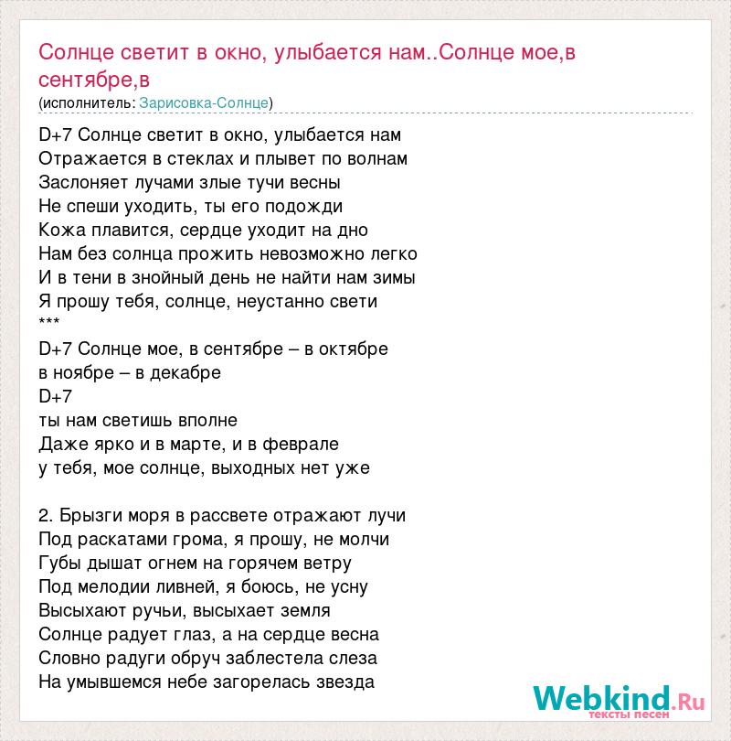 D+7 Солнце светит в окно, улыбается нам Отражается в стеклах и плывет по волнам Заслоняет лучами злые тучи весны Не спеши уходить, ты его подожди Кожа плавится, сердце уходит на дно Нам без солнца прожить невозможно легко И в тени в знойный день не найти нам зимы Я прошу тебя, солнце, неустанно свети *** D+7 Солнце мое, в сентябре – в октябре в ноябре – в декабре D+7 ты нам светишь вполне Даже ярко и в марте, и в феврале у тебя, мое солнце, выходных нет уже 2. Брызги моря в рассвете отражают лучи Под раскатами грома, я прошу, не молчи Губы дышат огнем на горячем ветру Под мелодии ливней, я боюсь, не усну Высыхают ручьи, высыхает земля Солнце радует глаз, а на сердце весна Словно радуги обруч заблестела слеза На умывшемся небе загорелась звезда