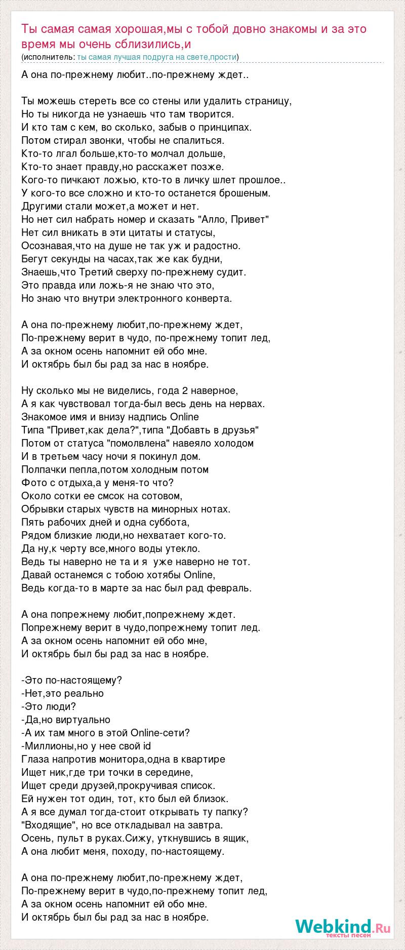 А она по-прежнему любит..по-прежнему ждет.. Ты можешь стереть все со стены или удалить страницу, Но ты никогда не узнаешь что там творится. И кто там с кем, во сколько, забыв о принципах. Потом стирал звонки, чтобы не спалиться. Кто-то лгал больше,кто-то молчал дольше, Кто-то знает правду,но расскажет позже. Кого-то пичкают ложью, кто-то в личку шлет прошлое.. У кого-то все сложно и кто-то останется брошеным. Другими стали может,а может и нет. Но нет сил набрать номер и сказать "Алло, Привет" Нет сил вникать в эти цитаты и статусы, Осознавая,что на душе не так уж и радостно. Бегут секунды на часах,так же как будни, Знаешь,что Третий сверху по-прежнему судит. Это правда или ложь-я не знаю что это, Но знаю что внутри электронного конверта. А она по-прежнему любит,по-прежнему ждет, По-прежнему верит в чудо, по-прежнему топит лед, А за окном осень напомнит ей обо мне. И октябрь был бы рад за нас в ноябре. Ну сколько мы не виделись, года 2 наверное, А я как чувствовал тогда-был весь день на нервах. Знакомое имя и внизу надпись Online Типа "Привет,как дела?",типа "Добавть в друзья" Потом от статуса "помолвлена" навеяло холодом И в третьем часу ночи я покинул дом. Полпачки пепла,потом холодным потом Фото с отдыха,а у меня-то что? Около сотки ее смсок на сотовом, Обрывки старых чувств на минорных нотах. Пять рабочих дней и одна суббота, Рядом близкие люди,но нехватает кого-то. Да ну,к черту все,много воды утекло. Ведь ты наверно не та и я уже наверно не тот. Давай останемся с тобою хотябы Online, Ведь когда-то в марте за нас был рад февраль. А она попрежнему любит,попрежнему ждет. Попрежнему верит в чудо,попрежнему топит лед. А за окном осень напомнит ей обо мне, И октябрь был бы рад за нас в ноябре. -Это по-настоящему? -Нет,это реально -Это люди? -Да,но виртуально -А их там много в этой Online-сети? -Миллионы,но у нее свой id Глаза напротив монитора,одна в квартире Ищет ник,где три точки в середине, Ищет среди друзей,прокручивая список. Ей нужен тот один, тот, кто был ей близок. А я все думал тогда-стоит открывать ту папку? "Входящие", но все откладывал на завтра. Осень, пульт в руках.Сижу, уткнувшись в ящик, А она любит меня, походу, по-настоящему. А она по-прежнему любит,по-прежнему ждет, По-прежнему верит в чудо,по-прежнему топит лед, А за окном осень напомнит ей обо мне. И октябрь был бы рад за нас в ноябре.