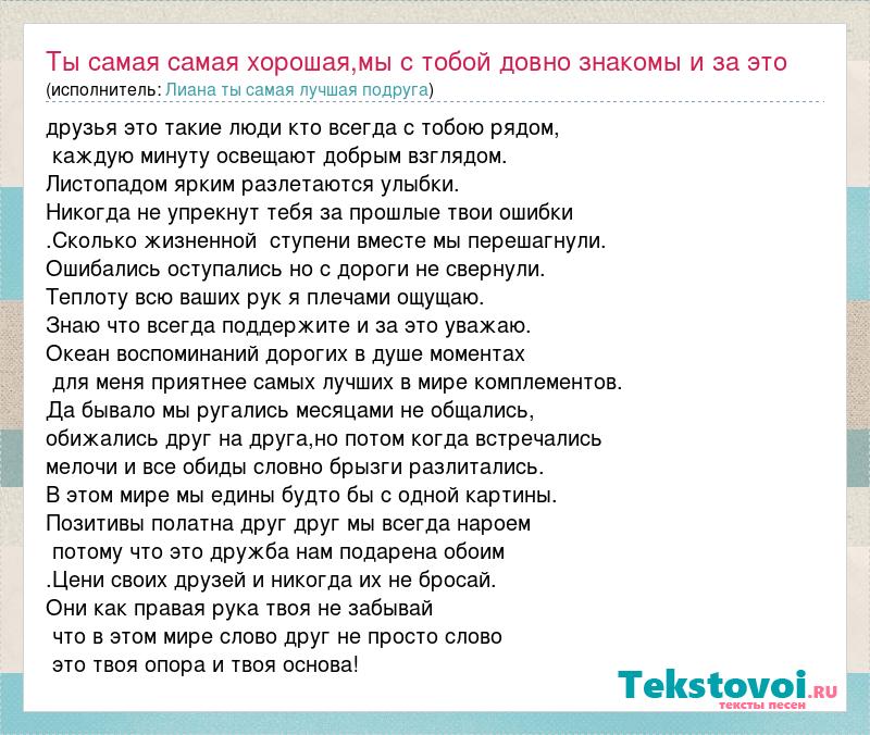 Главная→Исполнители→Лиана ты самая лучшая подруга на свете,прости что так редко звоню и пишу,главное знай чтобы не случилось я люблю тебя:*→Ты самая самая хорошая,мы с тобой довно знакомы и за это время мы очень