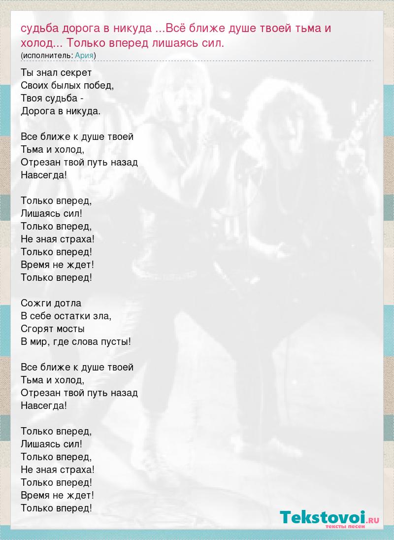 Ты знал секрет Своих былых побед, Твоя судьба - Дорога в никуда. Все ближе к душе твоей Тьма и холод, Отрезан твой путь назад Навсегда! Только вперед, Лишаясь сил! Только вперед, Не зная страха! Только вперед! Время не ждет! Только вперед! Сожги дотла В себе остатки зла, Сгорят мосты В мир, где слова пусты! Все ближе к душе твоей Тьма и холод, Отрезан твой путь назад Навсегда! Только вперед, Лишаясь сил! Только вперед, Не зная страха! Только вперед! Время не ждет! Только вперед!