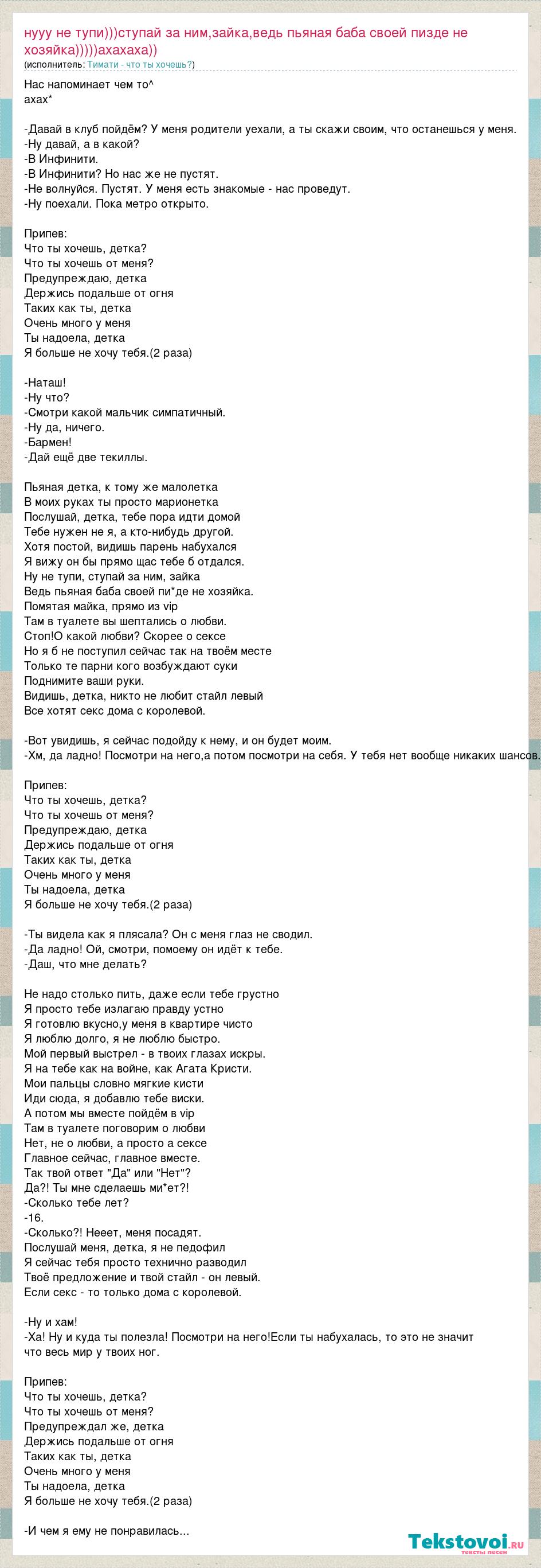 Нас напоминает чем то^ ахах* -Давай в клуб пойдём? У меня родители уехали, а ты скажи своим, что останешься у меня. -Ну давай, а в какой? -В Инфинити. -В Инфинити? Но нас же не пустят. -Не волнуйся. Пустят. У меня есть знакомые - нас проведут. -Ну поехали. Пока метро открыто. Припев: Что ты хочешь, детка? Что ты хочешь от меня? Предупреждаю, детка Держись подальше от огня Таких как ты, детка Очень много у меня Ты надоела, детка Я больше не хочу тебя.(2 раза) -Наташ! -Ну что? -Смотри какой мальчик симпатичный. -Ну да, ничего. -Бармен! -Дай ещё две текиллы. Пьяная детка, к тому же малолетка В моих руках ты просто марионетка Послушай, детка, тебе пора идти домой Тебе нужен не я, а кто-нибудь другой. Хотя постой, видишь парень набухался Я вижу он бы прямо щас тебе б отдался. Ну не тупи, ступай за ним, зайка Ведь пьяная баба своей пи*де не хозяйка. Помятая майка, прямо из vip Там в туалете вы шептались о любви. Стоп!О какой любви? Скорее о сексе Но я б не поступил сейчас так на твоём месте Только те парни кого возбуждают суки Поднимите ваши руки. Видишь, детка, никто не любит стайл левый Все хотят секс дома с королевой. -Вот увидишь, я сейчас подойду к нему, и он будет моим. -Хм, да ладно! Посмотри на него,а потом посмотри на себя. У тебя нет вообще никаких шансов. Припев: Что ты хочешь, детка? Что ты хочешь от меня? Предупреждаю, детка Держись подальше от огня Таких как ты, детка Очень много у меня Ты надоела, детка Я больше не хочу тебя.(2 раза) -Ты видела как я плясала? Он с меня глаз не сводил. -Да ладно! Ой, смотри, помоему он идёт к тебе. -Даш, что мне делать? Не надо столько пить, даже если тебе грустно Я просто тебе излагаю правду устно Я готовлю вкусно,у меня в квартире чисто Я люблю долго, я не люблю быстро. Мой первый выстрел - в твоих глазах искры. Я на тебе как на войне, как Агата Кристи. Мои пальцы словно мягкие кисти Иди сюда, я добавлю тебе виски. А потом мы вместе пойдём в vip Там в туалете поговорим о любви Нет, не о любви, а просто а сексе Главное сейчас, главное вместе. Так твой ответ "Да" или "Нет"? Да?! Ты мне сделаешь ми*ет?! -Сколько тебе лет? -16. -Сколько?! Нееет, меня посадят. Послушай меня, детка, я не педофил Я сейчас тебя просто технично разводил Твоё предложение и твой стайл - он левый. Если секс - то только дома с королевой. -Ну и хам! -Ха! Ну и куда ты полезла! Посмотри на него!Если ты набухалась, то это не значит что весь мир у твоих ног. Припев: Что ты хочешь, детка? Что ты хочешь от меня? Предупреждал же, детка Держись подальше от огня Таких как ты, детка Очень много у меня Ты надоела, детка Я больше не хочу тебя.(2 раза) -И чем я ему не понравилась...