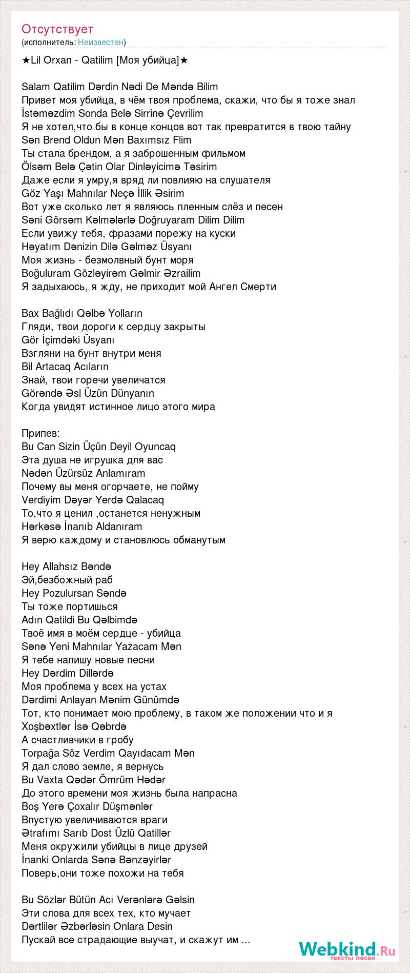 ★Lil Orxan - Qatilim [Моя убийца]★ Salam Qatilim Dərdin Nədi De Məndə Bilim Привет моя убийца, в чём твоя проблема, скажи, что бы я тоже знал İstəməzdim Sonda Belə Sirrinə Çevrilim Я не хотел,что бы в конце концов вот так превратится в твою тайну Sən Brend Oldun Mən Baxımsız Flim Ты стала брендом, а я заброшенным фильмом Ölsəm Belə Çətin Olar Dinləyicimə Təsirim Даже если я умру,я вряд ли повлияю на слушателя Göz Yaşı Mahnılar Neçə İllik Əsirim Вот уже сколько лет я являюсь пленным слёз и песен Səni Görsəm Kəlmələrlə Doğruyaram Dilim Dilim Если увижу тебя, фразами порежу на куски Həyatım Dənizin Dilə Gəlməz Üsyanı Моя жизнь - безмолвный бунт моря Boğuluram Gözləyirəm Gəlmir Əzrailim Я задыхаюсь, я жду, не приходит мой Ангел Смерти Bax Bağlıdı Qəlbə Yolların Гляди, твои дороги к сердцу закрыты Gör İçimdəki Üsyanı Взгляни на бунт внутри меня Bil Artacaq Acıların Знай, твои горечи увеличатся Görəndə Əsl Üzün Dünyanın Когда увидят истинное лицо этого мира Припев: Bu Can Sizin Üçün Deyil Oyuncaq Эта душа не игрушка для вас Nədən Üzürsüz Anlamıram Почему вы меня огорчаете, не пойму Verdiyim Dəyər Yerdə Qalacaq То,что я ценил ,останется ненужным Hərkəsə İnanıb Aldanıram Я верю каждому и становлюсь обманутым Hey Allahsız Bəndə Эй,безбожный раб Hey Pozulursan Səndə Ты тоже портишься Adın Qatildi Bu Qəlbimdə Твоё имя в моём сердце - убийца Sənə Yeni Mahnılar Yazacam Mən Я тебе напишу новые песни Hey Dərdim Dillərdə Моя проблема у всех на устах Dərdimi Anlayan Mənim Günümdə Тот, кто понимает мою проблему, в таком же положении что и я Xoşbəxtlər İsə Qəbrdə А счастливчики в гробу Torpağa Söz Verdim Qayıdacam Mən Я дал слово земле, я вернусь Bu Vaxta Qədər Ömrüm Hədər До этого времени моя жизнь была напрасна Boş Yerə Çoxalır Düşmənlər Впустую увеличиваются враги Ətrafımı Sarıb Dost Üzlü Qatillər Меня окружили убийцы в лице друзей İnanki Onlarda Sənə Bənzəyirlər Поверь,они тоже похожи на тебя Bu Sözlər Bütün Acı Verənlərə Gəlsin Эти слова для всех тех, кто мучает Dərtlilər Əzbərləsin Onlara Desin Пускай все страдающие выучат, и скажут им ...