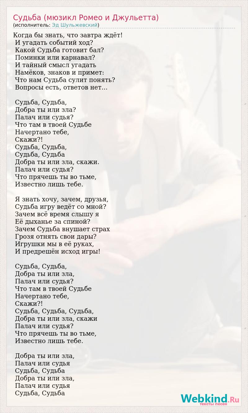 Когда бы знать, что завтра ждёт! И угадать событий ход? Какой Судьба готовит бал? Поминки или карнавал? И тайный смысл угадать Намёков, знаков и примет: Что нам Судьба сулит понять? Вопросы есть, ответов нет… Судьба, Судьба, Добра ты или зла? Палач или судья? Что там в твоей Судьбе Начертано тебе, Скажи?! Судьба, Судьба, Судьба, Судьба Добра ты или зла, скажи. Палач или судья? Что прячешь ты во тьме, Известно лишь тебе. Я знать хочу, зачем, друзья, Судьба игру ведёт со мной? Зачем всё время слышу я Её дыханье за спиной? Зачем Судьба внушает страх Грозя отнять свои дары? Игрушки мы в её руках, И предрешён исход игры! Судьба, Судьба, Добра ты или зла, Палач или судья? Что там в твоей Судьбе Начертано тебе, Скажи?! Судьба, Судьба, Судьба, Добра ты или зла, скажи Палач или судья? Что прячешь ты во тьме, Известно лишь тебе. Добра ты или зла, Палач или судья Судьба, Судьба Добра ты или зла, Палач или судья Судьба, Судьба