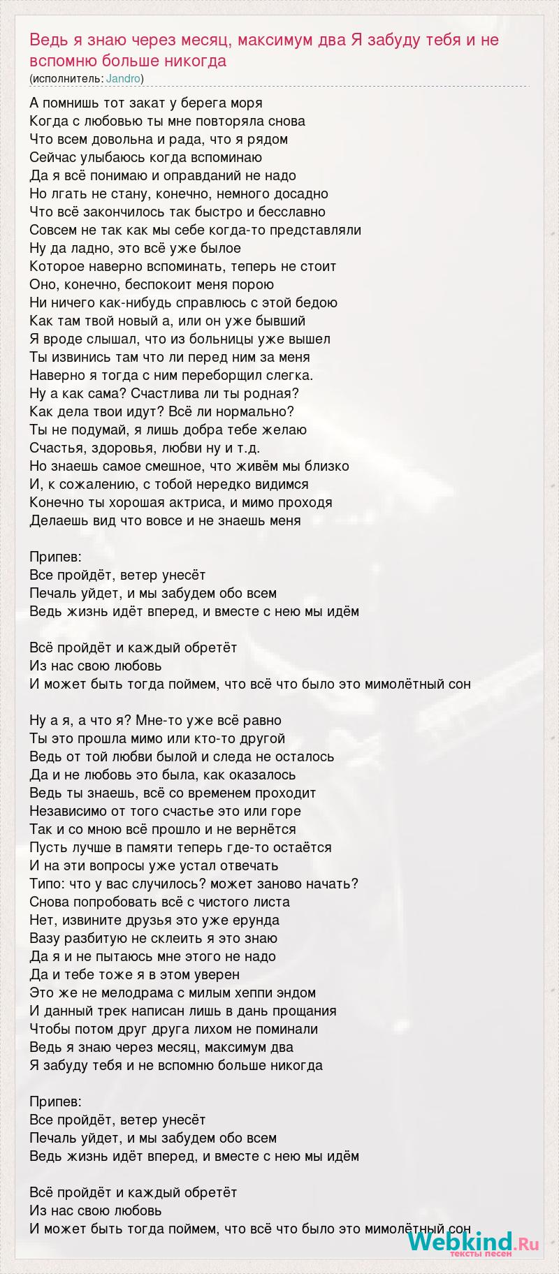 Ведь я знаю через месяц, максимум два Я забуду тебя и не вспомню больш