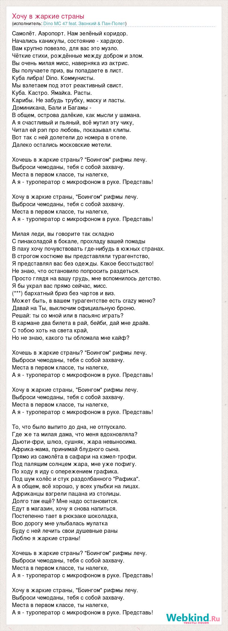 Самолёт. Аэропорт. Нам зелёный коридор. Начались каникулы, состояние - хардкор. Вам крупно повезло, для вас это музло. Чёткие стихи, рождённые между добром и злом. Вы очень милая мисс, наверняка из актрис. Вы получаете приз, вы попадаете в лист. Куба либра! Dino. Коммунисты. Мы взлетаем под этот реактивный свист. Куба. Кастро. Ямайка. Расты. Карибы. Не забудь трубку, маску и ласты. Доминикана, Бали и Багамы - В общем, острова далёкие, как мысли у шамана. А я счастливый и пьяный, всё мутил эту чику, Читал ей рэп про любовь, показывал клипы. Вот так с ней долетели до номера в отеле. Далеко остались московские метели. Хочешь в жаркие страны? "Боингом" рифмы лечу. Выброси чемоданы, тебя с собой захвачу. Места в первом классе, ты налегке, А я - туроператор с микрофоном в руке. Представь! Хочу в жаркие страны, "Боингом" рифмы лечу. Выброси чемоданы, тебя с собой захвачу. Места в первом классе, ты налегке, А я - туроператор с микрофоном в руке. Представь! Милая леди, вы говорите так складно С пинаколадой в бокале, прохладу вашей помады В паху хочу почувствовать где-нибудь в южных странах. В строгом костюме вы представляли турагентство, Я представлял вас без одежды. Какое бесстыдство! Не знаю, что остановило попросить раздеться. Просто глядя на вашу грудь, мне вспомнилось детство. Я бы украл вас прямо сейчас, мисс. (***) бархатный бриз без чартов и виз. Может быть, в вашем турагентстве есть crazy меню? Давай на Ты, выключим официальную броню. Решай: ты со мной или в пасьянс играть? В кармане два билета в рай, бейби, дай мне драйв. С тобою хоть на света край, Но не знаю, какого ты обломала мне кайф? Хочешь в жаркие страны? "Боингом" рифмы лечу. Выброси чемоданы, тебя с собой захвачу. Места в первом классе, ты налегке, А я - туроператор с микрофоном в руке. Представь! Хочу в жаркие страны, "Боингом" рифмы лечу. Выброси чемоданы, тебя с собой захвачу. Места в первом классе, ты налегке, А я - туроператор с микрофоном в руке. Представь! То, что было выпито до дна, не отпускало. Где же та милая дама, что меня вдохновляла? Дьюти-фри, шлюз, сушняк, жара невыносима. Африка-мама, принимай блудного сына. Прямо из самолёта в сафари на кэмел-трофи. Под палящим солнцем жара, мне уже пофигу. По ходу я иду с опережением графика. Под шум колёс и стук раздолбанного "Рафика". А в общем, всё хорошо, у всех улыбки на лицах. Африканцы взгрели пацана из столицы. Долго там ещё? Мне надо остановится. Едут в магазин, хочу я снова напиться. Постепенно тает в рюкзаке шоколадка, Всю дорогу мне улыбалась мулатка Буду с ней лечить свои душевные раны Люблю я жаркие страны! Хочешь в жаркие страны? "Боингом" рифмы лечу. Выброси чемоданы, тебя с собой захвачу. Места в первом классе, ты налегке, А я - туроператор с микрофоном в руке. Представь! Хочу в жаркие страны, "Боингом" рифмы лечу. Выброси чемоданы, тебя с собой захвачу. Места в первом классе, ты налегке, А я - туроператор с микрофоном в руке. Представь!