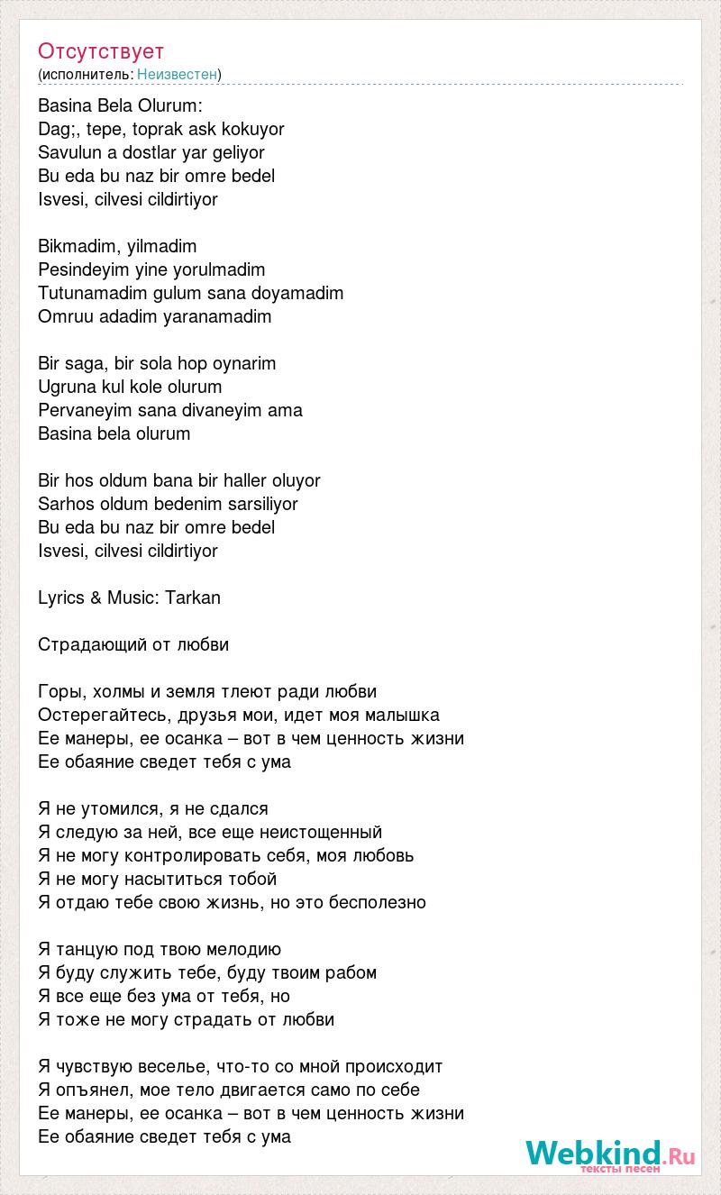 Basina Bela Olurum: Dag;, tepe, toprak ask kokuyor Savulun a dostlar yar geliyor Bu eda bu naz bir omre bedel Isvesi, cilvesi cildirtiyor Bikmadim, yilmadim Pesindeyim yine yorulmadim Tutunamadim gulum sana doyamadim Omruu adadim yaranamadim Bir saga, bir sola hop oynarim Ugruna kul kole olurum Pervaneyim sana divaneyim ama Basina bela olurum Bir hos oldum bana bir haller oluyor Sarhos oldum bedenim sarsiliyor Bu eda bu naz bir omre bedel Isvesi, cilvesi cildirtiyor Lyrics & Music: Tarkan Страдающий от любви Горы, холмы и земля тлеют ради любви Остерегайтесь, друзья мои, идет моя малышка Ее манеры, ее осанка – вот в чем ценность жизни Ее обаяние сведет тебя с ума Я не утомился, я не сдался Я следую за ней, все еще неистощенный Я не могу контролировать себя, моя любовь Я не могу насытиться тобой Я отдаю тебе свою жизнь, но это бесполезно Я танцую под твою мелодию Я буду служить тебе, буду твоим рабом Я все еще без ума от тебя, но Я тоже не могу страдать от любви Я чувствую веселье, что-то со мной происходит Я опъянел, мое тело двигается само по себе Ее манеры, ее осанка – вот в чем ценность жизни Ее обаяние сведет тебя с ума