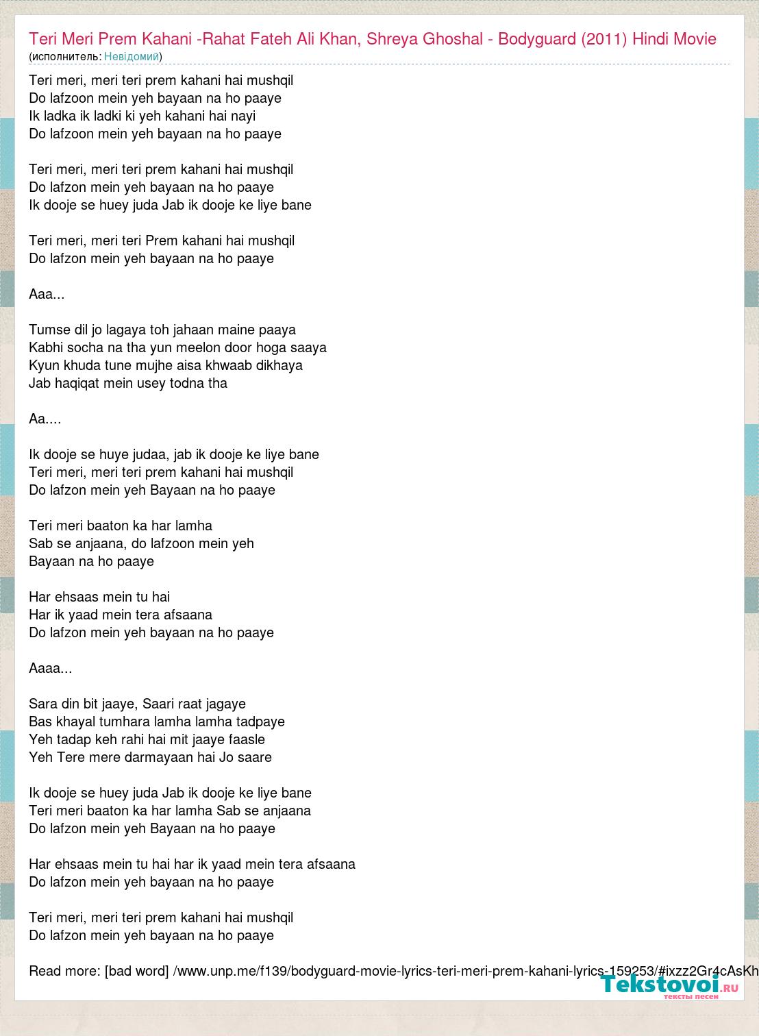 Teri meri, meri teri prem kahani hai mushqil Do lafzoon mein yeh bayaan na ho paaye Ik ladka ik ladki ki yeh kahani hai nayi Do lafzoon mein yeh bayaan na ho paaye Teri meri, meri teri prem kahani hai mushqil Do lafzon mein yeh bayaan na ho paaye Ik dooje se huey juda Jab ik dooje ke liye bane Teri meri, meri teri Prem kahani hai mushqil Do lafzon mein yeh bayaan na ho paaye Aaa... Tumse dil jo lagaya toh jahaan maine paaya Kabhi socha na tha yun meelon door hoga saaya Kyun khuda tune mujhe aisa khwaab dikhaya Jab haqiqat mein usey todna tha Aa.... Ik dooje se huye judaa, jab ik dooje ke liye bane Teri meri, meri teri prem kahani hai mushqil Do lafzon mein yeh Bayaan na ho paaye Teri meri baaton ka har lamha Sab se anjaana, do lafzoon mein yeh Bayaan na ho paaye Har ehsaas mein tu hai Har ik yaad mein tera afsaana Do lafzon mein yeh bayaan na ho paaye Aaaa... Sara din bit jaaye, Saari raat jagaye Bas khayal tumhara lamha lamha tadpaye Yeh tadap keh rahi hai mit jaaye faasle Yeh Tere mere darmayaan hai Jo saare Ik dooje se huey juda Jab ik dooje ke liye bane Teri meri baaton ka har lamha Sab se anjaana Do lafzon mein yeh Bayaan na ho paaye Har ehsaas mein tu hai har ik yaad mein tera afsaana Do lafzon mein yeh bayaan na ho paaye Teri meri, meri teri prem kahani hai mushqil Do lafzon mein yeh bayaan na ho paaye Read more: [bad word] /www.unp.me/f139/bodyguard-movie-lyrics-teri-meri-prem-kahani-lyrics-159253/#ixzz2Gr4cAsKh
