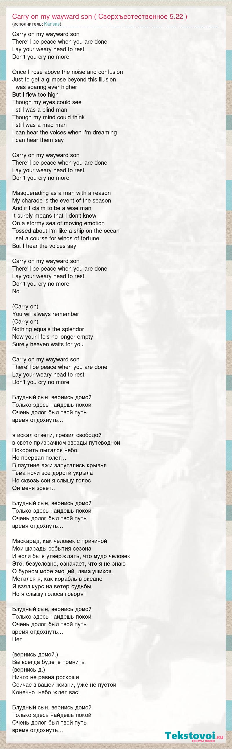 Carry on my wayward son There'll be peace when you are done Lay your weary head to rest Don't you cry no more Once I rose above the noise and confusion Just to get a glimpse beyond this illusion I was soaring ever higher But I flew too high Though my eyes could see I still was a blind man Though my mind could think I still was a mad man I can hear the voices when I'm dreaming I can hear them say Carry on my wayward son There'll be peace when you are done Lay your weary head to rest Don't you cry no more Masquerading as a man with a reason My charade is the event of the season And if I claim to be a wise man It surely means that I don't know On a stormy sea of moving emotion Tossed about I'm like a ship on the ocean I set a course for winds of fortune But I hear the voices say Carry on my wayward son There'll be peace when you are done Lay your weary head to rest Don't you cry no more No (Carry on) You will always remember (Carry on) Nothing equals the splendor Now your life's no longer empty Surely heaven waits for you Carry on my wayward son There'll be peace when you are done Lay your weary head to rest Don't you cry no more Блудный сын, вернись домой Только здесь найдешь покой Очень долог был твой путь время отдохнуть... я искал ответи, грезил свободой в свете призрачном звезды путеводной Покорить пытался небо, Но прервал полет... В паутине лжи запутались крылья Тьма ночи все дороги укрыла Но сквозь сон я слышу голос Он меня зовет.. Блудный сын, вернись домой Только здесь найдешь покой Очень долог был твой путь время отдохнуть... Маскарад, как человек с причиной Мои шарады события сезона И если бы я утверждать, что мудр человек Это, безусловно, означает, что я не знаю О бурном море эмоций, движущихся. Метался я, как корабль в океане Я взял курс на ветер судьбы, Но я слышу голоса говорят Блудный сын, вернись домой Только здесь найдешь покой Очень долог был твой путь время отдохнуть... Нет (вернись домой.) Вы всегда будете помнить (вернись д.) Ничто не равна роскоши Сейчас в вашей жизни, уже не пустой Конечно, небо ждет вас! Блудный сын, вернись домой Только здесь найдешь покой Очень долог был твой путь время отдохнуть...