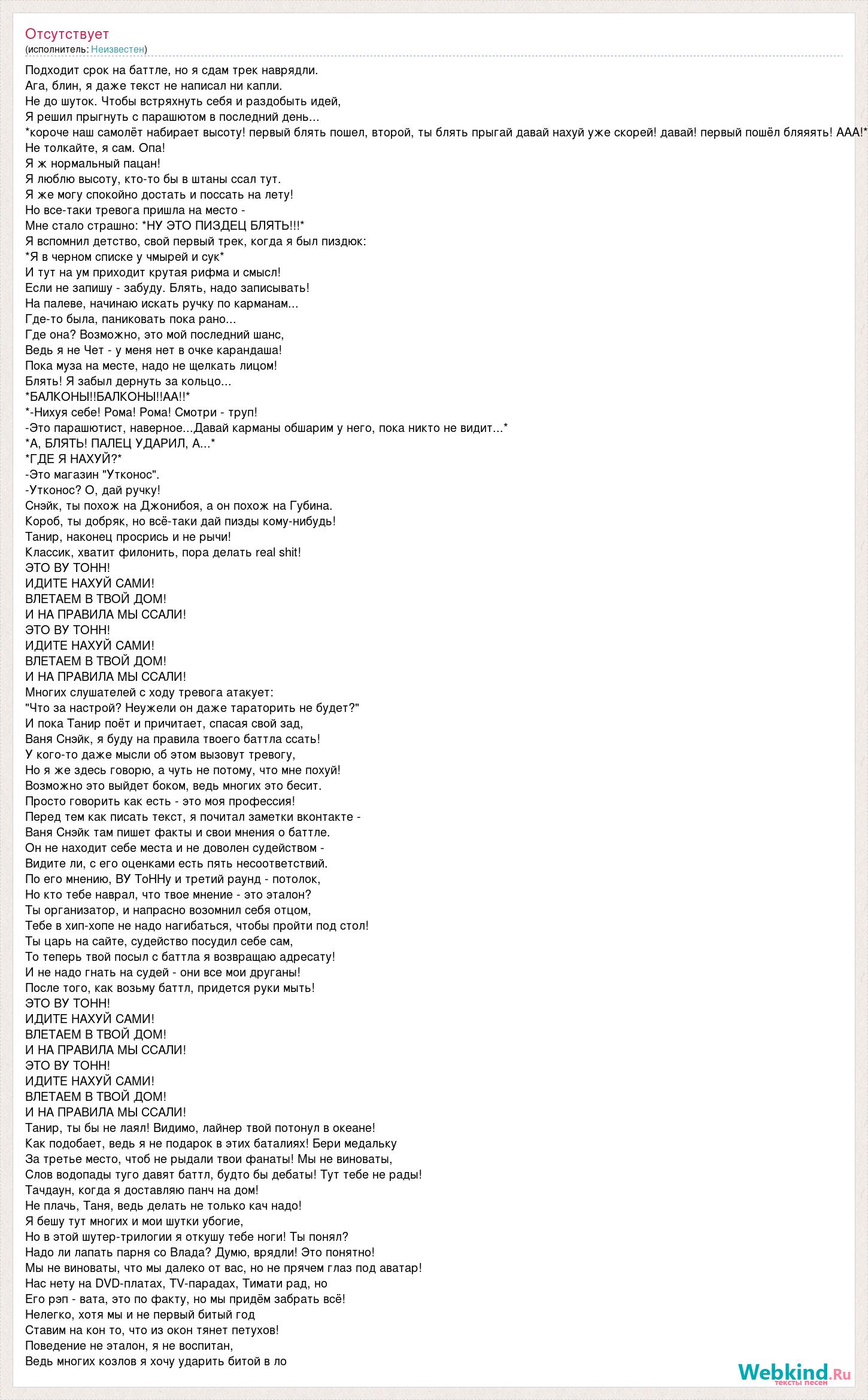 Подходит срок на баттле, но я сдам трек наврядли. Ага, блин, я даже текст не написал ни капли. Не до шуток. Чтобы встряхнуть себя и раздобыть идей, Я решил прыгнуть с парашютом в последний день... *короче наш самолёт набирает высоту! первый блять пошел, второй, ты блять прыгай давай нахуй уже скорей! давай! первый пошёл бляяять! ААА!* Не толкайте, я сам. Опа! Я ж нормальный пацан! Я люблю высоту, кто-то бы в штаны ссал тут. Я же могу спокойно достать и поссать на лету! Но все-таки тревога пришла на место - Мне стало страшно: *НУ ЭТО ПИЗДЕЦ БЛЯТЬ!!!* Я вспомнил детство, свой первый трек, когда я был пиздюк: *Я в черном списке у чмырей и сук* И тут на ум приходит крутая рифма и смысл! Если не запишу - забуду. Блять, надо записывать! На палеве, начинаю искать ручку по карманам... Где-то была, паниковать пока рано... Где она? Возможно, это мой последний шанс, Ведь я не Чет - у меня нет в очке карандаша! Пока муза на месте, надо не щелкать лицом! Блять! Я забыл дернуть за кольцо... *БАЛКОНЫ!!БАЛКОНЫ!!АА!!* *-Нихуя себе! Рома! Рома! Смотри - труп! -Это парашютист, наверное...Давай карманы обшарим у него, пока никто не видит...* *А, БЛЯТЬ! ПАЛЕЦ УДАРИЛ, А...* *ГДЕ Я НАХУЙ?* -Это магазин "Утконос". -Утконос? О, дай ручку! Снэйк, ты похож на Джонибоя, а он похож на Губина. Короб, ты добряк, но всё-таки дай пизды кому-нибудь! Танир, наконец просрись и не рычи! Классик, хватит филонить, пора делать real shit! ЭТО ВУ ТОНН! ИДИТЕ НАХУЙ САМИ! ВЛЕТАЕМ В ТВОЙ ДОМ! И НА ПРАВИЛА МЫ ССАЛИ! ЭТО ВУ ТОНН! ИДИТЕ НАХУЙ САМИ! ВЛЕТАЕМ В ТВОЙ ДОМ! И НА ПРАВИЛА МЫ ССАЛИ! Многих слушателей с ходу тревога атакует: "Что за настрой? Неужели он даже тараторить не будет?" И пока Танир поёт и причитает, спасая свой зад, Ваня Снэйк, я буду на правила твоего баттла ссать! У кого-то даже мысли об этом вызовут тревогу, Но я же здесь говорю, а чуть не потому, что мне похуй! Возможно это выйдет боком, ведь многих это бесит. Просто говорить как есть - это моя профессия! Перед тем как писать текст, я почитал заметки вконтакте - Ваня Снэйк там пишет факты и свои мнения о баттле. Он не находит себе места и не доволен судейством - Видите ли, с его оценками есть пять несоответствий. По его мнению, ВУ ТоННу и третий раунд - потолок, Но кто тебе наврал, что твое мнение - это эталон? Ты организатор, и напрасно возомнил себя отцом, Тебе в хип-хопе не надо нагибаться, чтобы пройти под стол! Ты царь на сайте, судейство посудил себе сам, То теперь твой посыл с баттла я возвращаю адресату! И не надо гнать на судей - они все мои друганы! После того, как возьму баттл, придется руки мыть! ЭТО ВУ ТОНН! ИДИТЕ НАХУЙ САМИ! ВЛЕТАЕМ В ТВОЙ ДОМ! И НА ПРАВИЛА МЫ ССАЛИ! ЭТО ВУ ТОНН! ИДИТЕ НАХУЙ САМИ! ВЛЕТАЕМ В ТВОЙ ДОМ! И НА ПРАВИЛА МЫ ССАЛИ! Танир, ты бы не лаял! Видимо, лайнер твой потонул в океане! Как подобает, ведь я не подарок в этих баталиях! Бери медальку За третье место, чтоб не рыдали твои фанаты! Мы не виноваты, Слов водопады туго давят баттл, будто бы дебаты! Тут тебе не рады! Тачдаун, когда я доставляю панч на дом! Не плачь, Таня, ведь делать не только кач надо! Я бешу тут многих и мои шутки убогие, Но в этой шутер-трилогии я откушу тебе ноги! Ты понял? Надо ли лапать парня со Влада? Думю, врядли! Это понятно! Мы не виноваты, что мы далеко от вас, но не прячем глаз под аватар! Нас нету на DVD-платах, TV-парадах, Тимати рад, но Его рэп - вата, это по факту, но мы придём забрать всё! Нелегко, хотя мы и не первый б