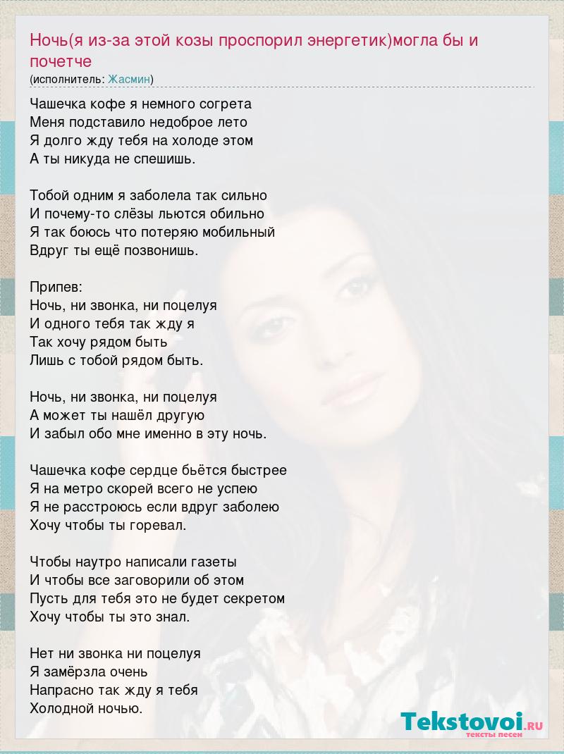 Главная→Исполнители→Жасмин→Ночь(я из-за этой козы проспорил энергетик)могла бы и почетче слова произносить)