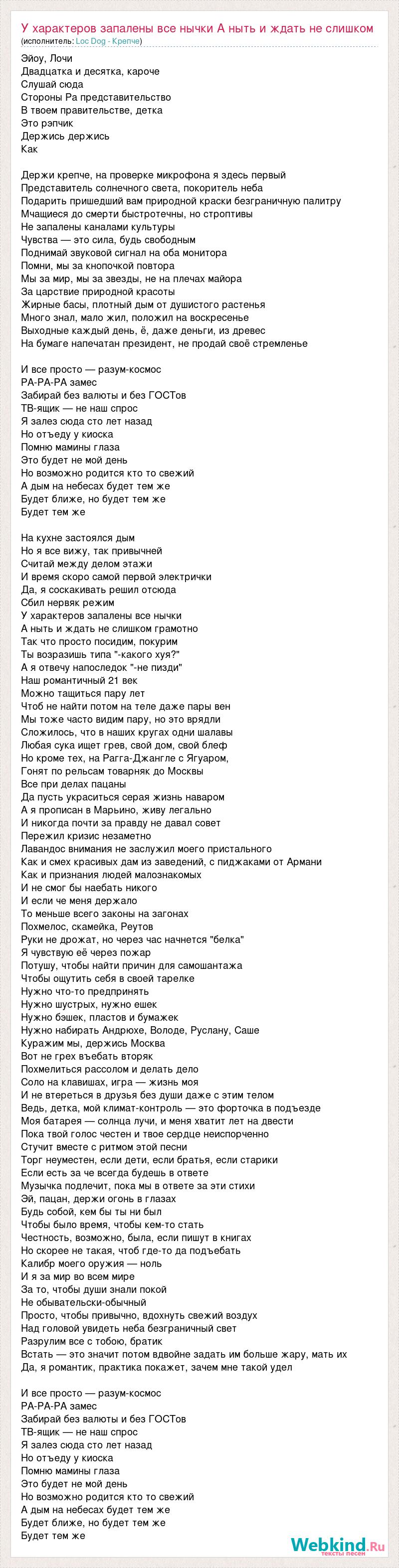 Эйоу, Лочи Двадцатка и десятка, кароче Слушай сюда Стороны Ра представительство В твоем правительстве, детка Это рэпчик Держись держись Как Держи крепче, на проверке микрофона я здесь первый Представитель солнечного света, покоритель неба Подарить пришедший вам природной краски безграничную палитру Мчащиеся до смерти быстротечны, но строптивы Не запалены каналами культуры Чувства — это сила, будь свободным Поднимай звуковой сигнал на оба монитора Помни, мы за кнопочкой повтора Мы за мир, мы за звезды, не на плечах майора За царствие природной красоты Жирные басы, плотный дым от душистого растенья Много знал, мало жил, положил на воскресенье Выходные каждый день, ё, даже деньги, из древес На бумаге напечатан президент, не продай своё стремленье И все просто — разум-космос РА-РА-РА замес Забирай без валюты и без ГОСТов ТВ-ящик — не наш спрос Я залез сюда сто лет назад Но отъеду у киоска Помню мамины глаза Это будет не мой день Но возможно родится кто то свежий А дым на небесах будет тем же Будет ближе, но будет тем же Будет тем же На кухне застоялся дым Но я все вижу, так привычней Считай между делом этажи И время скоро самой первой электрички Да, я соскакивать решил отсюда Сбил нервяк режим У характеров запалены все нычки А ныть и ждать не слишком грамотно Так что просто посидим, покурим Ты возразишь типа "-какого хуя?" А я отвечу напоследок "-не пизди" Наш романтичный 21 век Можно тащиться пару лет Чтоб не найти потом на теле даже пары вен Мы тоже часто видим пару, но это врядли Сложилось, что в наших кругах одни шалавы Любая сука ищет грев, свой дом, свой блеф Но кроме тех, на Рагга-Джангле с Ягуаром, Гонят по рельсам товарняк до Москвы Все при делах пацаны Да пусть украситься серая жизнь наваром А я прописан в Марьино, живу легально И никогда почти за правду не давал совет Пережил кризис незаметно Лавандос внимания не заслужил моего пристального Как и смех красивых дам из заведений, с пиджаками от Армани Как и признания людей малознакомых И не смог бы наебать никого И если че меня держало То меньше всего законы на загонах Похмелос, скамейка, Реутов Руки не дрожат, но через час начнется "белка" Я чувствую её через пожар Потушу, чтобы найти причин для самошантажа Чтобы ощутить себя в своей тарелке Нужно что-то предпринять Нужно шустрых, нужно ешек Нужно бэшек, пластов и бумажек Нужно набирать Андрюхе, Володе, Руслану, Саше Куражим мы, держись Москва Вот не грех въебать вторяк Похмелиться рассолом и делать дело Соло на клавишах, игра — жизнь моя И не втереться в друзья без души даже с этим телом Ведь, детка, мой климат-контроль — это форточка в подъезде Моя батарея — солнца лучи, и меня хватит лет на двести Пока твой голос честен и твое сердце неиспорченно Стучит вместе с ритмом этой песни Торг неуместен, если дети, если братья, если старики Если есть за че всегда будешь в ответе Музычка подлечит, пока мы в ответе за эти стихи Эй, пацан, держи огонь в глазах Будь собой, кем бы ты ни был Чтобы было время, чтобы кем-то стать Честность, возможно, была, если пишут в книгах Но скорее не такая, чтоб где-то да подъебать Калибр моего оружия — ноль И я за мир во всем мире За то, чтобы души знали покой Не обывательски-обычный Просто, чтобы привычно, вдохнуть свежий воздух Над головой увидеть неба безграничный свет Разрулим все с тобою, братик Встать — это значит по