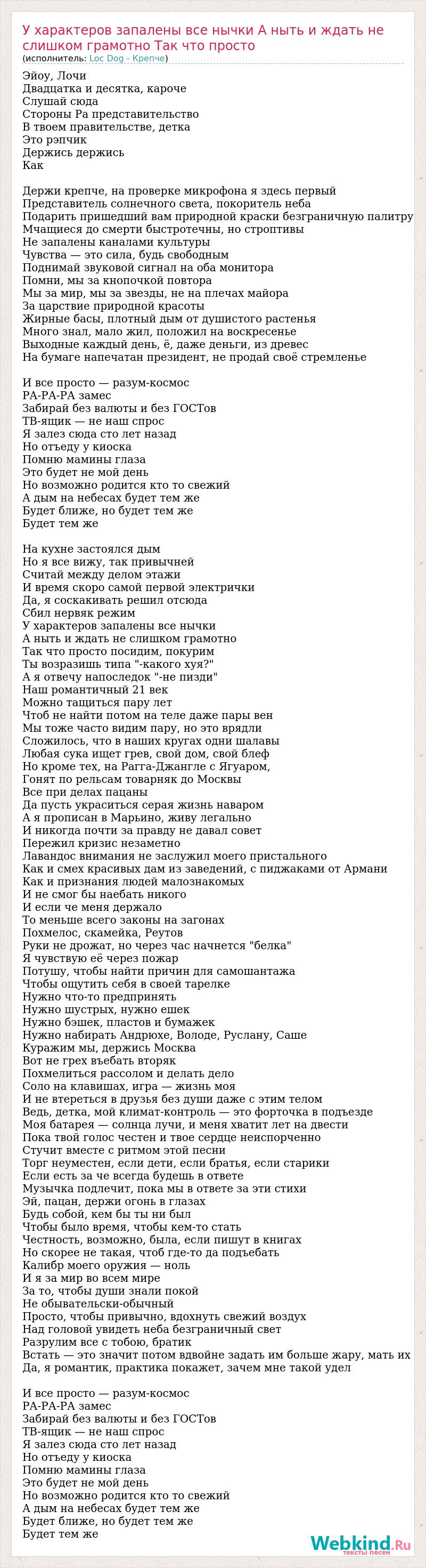 Эйоу, Лочи Двадцатка и десятка, кароче Слушай сюда Стороны Ра представительство В твоем правительстве, детка Это рэпчик Держись держись Как Держи крепче, на проверке микрофона я здесь первый Представитель солнечного света, покоритель неба Подарить пришедший вам природной краски безграничную палитру Мчащиеся до смерти быстротечны, но строптивы Не запалены каналами культуры Чувства — это сила, будь свободным Поднимай звуковой сигнал на оба монитора Помни, мы за кнопочкой повтора Мы за мир, мы за звезды, не на плечах майора За царствие природной красоты Жирные басы, плотный дым от душистого растенья Много знал, мало жил, положил на воскресенье Выходные каждый день, ё, даже деньги, из древес На бумаге напечатан президент, не продай своё стремленье И все просто — разум-космос РА-РА-РА замес Забирай без валюты и без ГОСТов ТВ-ящик — не наш спрос Я залез сюда сто лет назад Но отъеду у киоска Помню мамины глаза Это будет не мой день Но возможно родится кто то свежий А дым на небесах будет тем же Будет ближе, но будет тем же Будет тем же На кухне застоялся дым Но я все вижу, так привычней Считай между делом этажи И время скоро самой первой электрички Да, я соскакивать решил отсюда Сбил нервяк режим У характеров запалены все нычки А ныть и ждать не слишком грамотно Так что просто посидим, покурим Ты возразишь типа "-какого хуя?" А я отвечу напоследок "-не пизди" Наш романтичный 21 век Можно тащиться пару лет Чтоб не найти потом на теле даже пары вен Мы тоже часто видим пару, но это врядли Сложилось, что в наших кругах одни шалавы Любая сука ищет грев, свой дом, свой блеф Но кроме тех, на Рагга-Джангле с Ягуаром, Гонят по рельсам товарняк до Москвы Все при делах пацаны Да пусть украситься серая жизнь наваром А я прописан в Марьино, живу легально И никогда почти за правду не давал совет Пережил кризис незаметно Лавандос внимания не заслужил моего пристального Как и смех красивых дам из заведений, с пиджаками от Армани Как и признания людей малознакомых И не смог бы наебать никого И если че меня держало То меньше всего законы на загонах Похмелос, скамейка, Реутов Руки не дрожат, но через час начнется "белка" Я чувствую её через пожар Потушу, чтобы найти причин для самошантажа Чтобы ощутить себя в своей тарелке Нужно что-то предпринять Нужно шустрых, нужно ешек Нужно бэшек, пластов и бумажек Нужно набирать Андрюхе, Володе, Руслану, Саше Куражим мы, держись Москва Вот не грех въебать вторяк Похмелиться рассолом и делать дело Соло на клавишах, игра — жизнь моя И не втереться в друзья без души даже с этим телом Ведь, детка, мой климат-контроль — это форточка в подъезде Моя батарея — солнца лучи, и меня хватит лет на двести Пока твой голос честен и твое сердце неиспорченно Стучит вместе с ритмом этой песни Торг неуместен, если дети, если братья, если старики Если есть за че всегда будешь в ответе Музычка подлечит, пока мы в ответе за эти стихи Эй, пацан, держи огонь в глазах Будь собой, кем бы ты ни был Чтобы было время, чтобы кем-то стать Честность, возможно, была, если пишут в книгах Но скорее не такая, чтоб где-то да подъебать Калибр моего оружия — ноль И я за мир во всем мире За то, чтобы души знали покой Не обывательски-обычный Просто, чтобы привычно, вдохнуть свежий воздух Над головой увидеть неба безграничный свет Разрулим все с тобою, братик Встать — это значит по