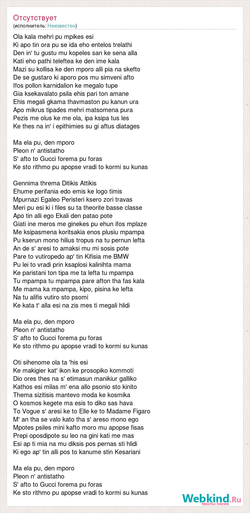 Ola kala mehri pu mpikes esi Ki apo tin ora pu se ida eho entelos trelathi Den in' tu gustu mu kopeles san ke sena alla Kati eho pathi teleftea ke den ime kala Mazi su kollisa ke den mporo alli pia na skefto De se gustaro ki aporo pos mu simveni afto Ifos pollon karnidalion ke megalo tupe Gia ksekavalato psila ehis pari ton amane Ehis megali gkama thavmaston pu kanun ura Apo mikrus tipades mehri matsomena pura Pezis me olus ke me ola, ipa ksipa tus les Ke thes na in' i epithimies su gi aftus diatages Ma ela pu, den mporo Pleon n' antistatho S' afto to Gucci forema pu foras Ke sto rithmo pu apopse vradi to kormi su kunas Gennima threma Ditikis Attikis Ehume perifania edo emis ke logo timis Mpurnazi Egaleo Peristeri ksero zori travas Meri pu esi ki i files su ta theorite basse classe Apo tin alli ego Ekali den patao pote Giati ine meros me ginekes pu ehun ifos mplaze Me ksipasmena koritsakia enos plusiu mpampa Pu kserun mono hilius tropus na tu pernun lefta An de s' aresi to amaksi mu mi sosis pote Pare to vutiropedo ap' tin Kifisia me BMW Pu lei to vradi prin ksaplosi kalinihta mama Ke paristani ton tipa me ta lefta tu mpampa Tu mpampa tu mpampa pare afton tha fas kala Me mama ka mpampa, kipo, pisina ke lefta Na tu alifis vutiro sto psomi Ke kata t' alla esi na zis mes ti megali hlidi Ma ela pu, den mporo Pleon n' antistatho S' afto to Gucci forema pu foras Ke sto rithmo pu apopse vradi to kormi su kunas Oti sihenome ola ta 'his esi Ke makigier kat' ikon ke prosopiko kommoti Dio ores thes na s' etimasun manikiur galliko Kathos esi milas m' ena allo psonio sto kinito Thema sizitisis mantevo moda ke kosmika O kosmos kegete ma esis to diko sas hava To Vogue s' aresi ke to Elle ke to Madame Figaro M' an tha se valo kato tha s' areso mono ego Mpotes psiles mini kafto moro mu apopse fisas Prepi oposdipote su leo na gini kati me mas Esi ap ti mia na mu diksis pos pernas sti hlidi Ki ego ap' tin alli pos to kanume stin Kesariani Ma ela pu, den mporo Pleon n' antistatho S' afto to Gucci forema pu foras Ke sto rithmo pu apopse vradi to kormi su kunas