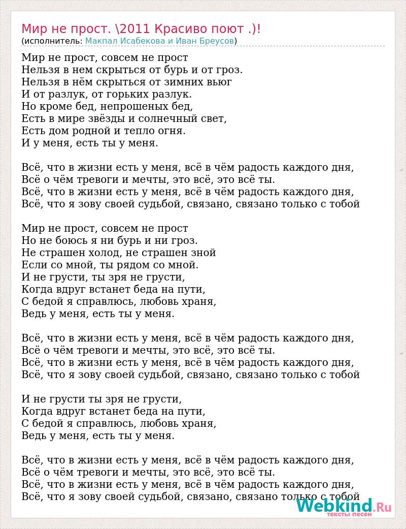 Мир не прост, совсем не прост Нельзя в нем скрыться от бурь и от гроз. Нельзя в нём скрыться от зимних вьюг И от разлук, от горьких разлук. Но кроме бед, непрошеных бед, Есть в мире звёзды и солнечный свет, Есть дом родной и тепло огня. И у меня, есть ты у меня. Всё, что в жизни есть у меня, всё в чём радость каждого дня, Всё о чём тревоги и мечты, это всё, это всё ты. Всё, что в жизни есть у меня, всё в чём радость каждого дня, Всё, что я зову своей судьбой, связано, связано только с тобой Мир не прост, совсем не прост Но не боюсь я ни бурь и ни гроз. Не страшен холод, не страшен зной Если со мной, ты рядом со мной. И не грусти, ты зря не грусти, Когда вдруг встанет беда на пути, С бедой я справлюсь, любовь храня, Ведь у меня, есть ты у меня. Всё, что в жизни есть у меня, всё в чём радость каждого дня, Всё о чём тревоги и мечты, это всё, это всё ты. Всё, что в жизни есть у меня, всё в чём радость каждого дня, Всё, что я зову своей судьбой, связано, связано только с тобой И не грусти ты зря не грусти, Когда вдруг встанет беда на пути, С бедой я справлюсь, любовь храня, Ведь у меня, есть ты у меня. Всё, что в жизни есть у меня, всё в чём радость каждого дня, Всё о чём тревоги и мечты, это всё, это всё ты. Всё, что в жизни есть у меня, всё в чём радость каждого дня, Всё, что я зову своей судьбой, связано, связано только с тобой