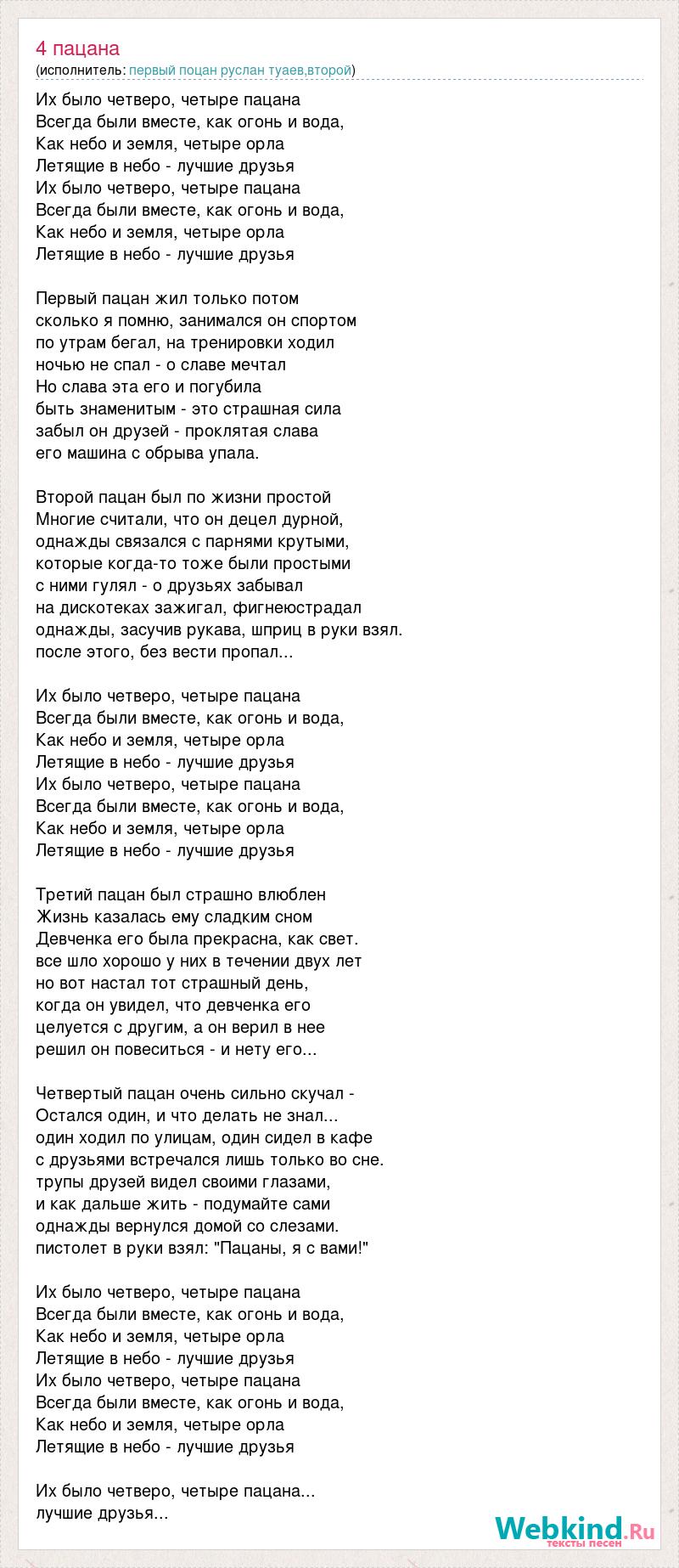 Их было четверо, четыре пацана Всегда были вместе, как огонь и вода, Как небо и земля, четыре орла Летящие в небо - лучшие друзья Их было четверо, четыре пацана Всегда были вместе, как огонь и вода, Как небо и земля, четыре орла Летящие в небо - лучшие друзья Первый пацан жил только потом сколько я помню, занимался он спортом по утрам бегал, на тренировки ходил ночью не спал - о славе мечтал Но слава эта его и погубила быть знаменитым - это страшная сила забыл он друзей - проклятая слава его машина с обрыва упала. Второй пацан был по жизни простой Многие считали, что он децел дурной, однажды связался с парнями крутыми, которые когда-то тоже были простыми с ними гулял - о друзьях забывал на дискотеках зажигал, фигнеюстрадал однажды, засучив рукава, шприц в руки взял. после этого, без вести пропал... Их было четверо, четыре пацана Всегда были вместе, как огонь и вода, Как небо и земля, четыре орла Летящие в небо - лучшие друзья Их было четверо, четыре пацана Всегда были вместе, как огонь и вода, Как небо и земля, четыре орла Летящие в небо - лучшие друзья Третий пацан был страшно влюблен Жизнь казалась ему сладким сном Девченка его была прекрасна, как свет. все шло хорошо у них в течении двух лет но вот настал тот страшный день, когда он увидел, что девченка его целуется с другим, а он верил в нее решил он повеситься - и нету его... Четвертый пацан очень сильно скучал - Остался один, и что делать не знал... один ходил по улицам, один сидел в кафе с друзьями встречался лишь только во сне. трупы друзей видел своими глазами, и как дальше жить - подумайте сами однажды вернулся домой со слезами. пистолет в руки взял: "Пацаны, я с вами!" Их было четверо, четыре пацана Всегда были вместе, как огонь и вода, Как небо и земля, четыре орла Летящие в небо - лучшие друзья Их было четверо, четыре пацана Всегда были вместе, как огонь и вода, Как небо и земля, четыре орла Летящие в небо - лучшие друзья Их было четверо, четыре пацана... лучшие друзья...