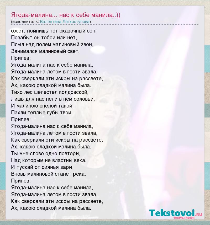 ожет, помнишь тот сказочный сон, Позабыт он тобой или нет, Плыл над полем малиновый звон, Занимался малиновый свет. Припев: Ягода-малина нас к себе манила, Ягода-малина летом в гости звала, Как сверкали эти искры на рассвете, Ах, какою сладкой малина была. Тихо лес шелестел колдовской, Лишь для нас пели в нем соловьи, И малиною спелой такой Пахли теплые губы твои. Припев: Ягода-малина нас к себе манила, Ягода-малина летом в гости звала, Как сверкали эти искры на рассвете, Ах, какою сладкой малина была. Ты мне слово одно повтори, Над которым не властны века. И пускай от сиянья зари Вновь малиновой станет река. Припев: Ягода-малина нас к себе манила, Ягода-малина летом в гости звала, Как сверкали эти искры на рассвете, Ах, какою сладкой малина была.