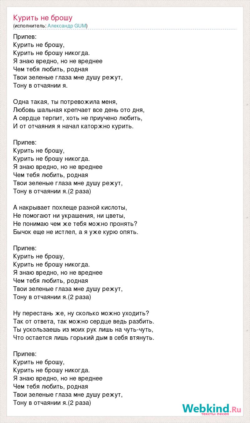 Припев: Курить не брошу, Курить не брошу никогда. Я знаю вредно, но не вреднее Чем тебя любить, родная Твои зеленые глаза мне душу режут, Тону в отчаянии я. Одна такая, ты потревожила меня, Любовь шальная крепчает все день ото дня, А сердце терпит, хоть не приучено любить, И от отчаяния я начал каторжно курить. Припев: Курить не брошу, Курить не брошу никогда. Я знаю вредно, но не вреднее Чем тебя любить, родная Твои зеленые глаза мне душу режут, Тону в отчаянии я.(2 раза) А накрывает похлеще разной кислоты, Не помогают ни украшения, ни цветы, Не понимаю чем же тебя можно пронять? Бычок еще не истлел, а я уже курю опять. Припев: Курить не брошу, Курить не брошу никогда. Я знаю вредно, но не вреднее Чем тебя любить, родная Твои зеленые глаза мне душу режут, Тону в отчаянии я.(2 раза) Ну перестань же, ну сколько можно уходить? Так от ответа, так можно сердце ведь разбить. Ты ускользаешь из моих рук лишь на чуть-чуть, Что остается лишь горький дым в себя втянуть. Припев: Курить не брошу, Курить не брошу никогда. Я знаю вредно, но не вреднее Чем тебя любить, родная Твои зеленые глаза мне душу режут, Тону в отчаянии я.(2 раза)