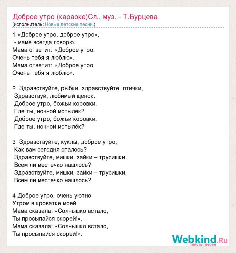 1 «Доброе утро, доброе утро», - маме всегда говорю. Мама ответит: «Доброе утро. Очень тебя я люблю». Мама ответит: «Доброе утро. Очень тебя я люблю». 2 Здравствуйте, рыбки, здравствуйте, птички, Здравствуй, любимый щенок. Доброе утро, божьи коровки. Где ты, ночной мотылёк? Доброе утро, божьи коровки. Где ты, ночной мотылёк? 3 Здравствуйте, куклы, доброе утро, Как вам сегодня спалось? Здравствуйте, мишки, зайки – трусишки, Всем ли местечко нашлось? Здравствуйте, мишки, зайки – трусишки, Всем ли местечко нашлось? 4 Доброе утро, очень уютно Утром в кроватке моей. Мама сказала: «Солнышко встало, Ты просыпайся скорей!». Мама сказала: «Солнышко встало, Ты просыпайся скорей!».