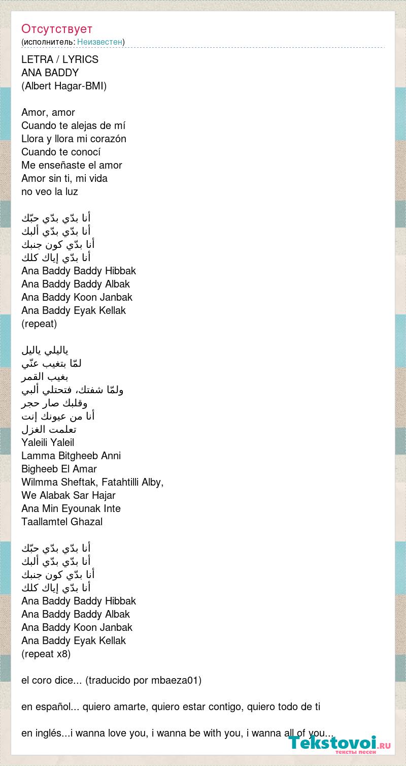 LETRA / LYRICS ANA BADDY (Albert Hagar-BMI) Amor, amor Cuando te alejas de mí Llora y llora mi corazón Cuando te conocí Me enseñaste el amor Amor sin ti, mi vida no veo la luz أنا بدّي بدّي حبّك أنا بدّي بدّي ألبك أنا بدّي كون جنبك أنا بدّي إياك كلك Ana Baddy Baddy Hibbak Ana Baddy Baddy Albak Ana Baddy Koon Janbak Ana Baddy Eyak Kellak (repeat) ياليلي ياليل لمّا بتغيب عنّي بغيب القمر ولمّا شفتك، فتحتلي ألبي وقلبك صار حجر أنا من عيونك إنت تعلمت الغزل Yaleili Yaleil Lamma Bitgheeb Anni Bigheeb El Amar Wilmma Sheftak, Fatahtilli Alby, We Alabak Sar Hajar Ana Min Eyounak Inte Taallamtel Ghazal أنا بدّي بدّي حبّك أنا بدّي بدّي ألبك أنا بدّي كون جنبك أنا بدّي إياك كلك Ana Baddy Baddy Hibbak Ana Baddy Baddy Albak Ana Baddy Koon Janbak Ana Baddy Eyak Kellak (repeat x8) el coro dice... (traducido por mbaeza01) en español... quiero amarte, quiero estar contigo, quiero todo de ti en inglés...i wanna love you, i wanna be with you, i wanna all of you...