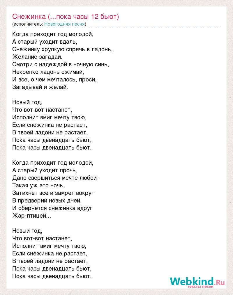 Когда приходит год молодой, А старый уходит вдаль, Снежинку хрупкую спрячь в ладонь, Желание загадай. Смотри с надеждой в ночную синь, Некрепко ладонь сжимай, И все, о чем мечталось, проси, Загадывай и желай. Новый год, Что вот-вот настанет, Исполнит вмиг мечту твою, Если снежинка не растает, В твоей ладони не растает, Пока часы двенадцать бьют, Пока часы двенадцать бьют. Когда приходит год молодой, А старый уходит прочь, Дано свершиться мечте любой - Такая уж это ночь. Затихнет все и замрет вокруг В предверии новых дней, И обернется снежинка вдруг Жар-птицей... Новый год, Что вот-вот настанет, Исполнит вмиг мечту твою, Если снежинка не растает, В твоей ладони не растает, Пока часы двенадцать бьют, Пока часы двенадцать бьют.
