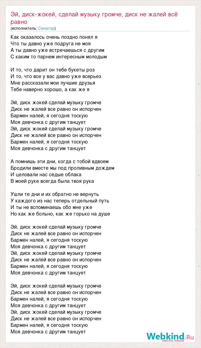 Как оказалось очень поздно понял я Что ты давно уже подруга не моя А ты давно уже встречаешься с другим С каким то парнем интересным молодым И то, что дарит он тебе букеты роз И то, что все у вас давно уже всерьез Мне расcказали мои лучшие друзья Тебе наверно хорошо, а как же я Эй, диск жокей сделай музыку громче Диск не жалей все равно он испорчен Бармен налей, я сегодня тоскую Моя девчонка с другим танцует Эй, диск жокей сделай музыку громче Диск не жалей все равно он испорчен Бармен налей, я сегодня тоскую Моя девчонка с другим танцует А помнишь эти дни, когда с тобой вдвоем Бродили вместе мы под проливным дождем И целовали нас седые облака В моей руке всегда была твоя рука Ушли те дни и их обратно не вернуть У каждого из нас теперь отдельный путь И ты не вспоминаешь обо мне уже Но как же больно, как же горько на душе Эй, диск жокей сделай музыку громче Диск не жалей все равно он испорчен Бармен налей, я сегодня тоскую Моя девчонка с другим танцует Эй, диск жокей сделай музыку громче Диск не жалей все равно он испорчен Бармен налей, я сегодня тоскую Моя девчонка с другим танцует Эй, диск жокей сделай музыку громче Диск не жалей все равно он испорчен Бармен налей, я сегодня тоскую Моя девчонка с другим танцует Эй, диск жокей сделай музыку громче Диск не жалей все равно он испорчен Бармен налей, я сегодня тоскую Моя девчонка с другим танцует