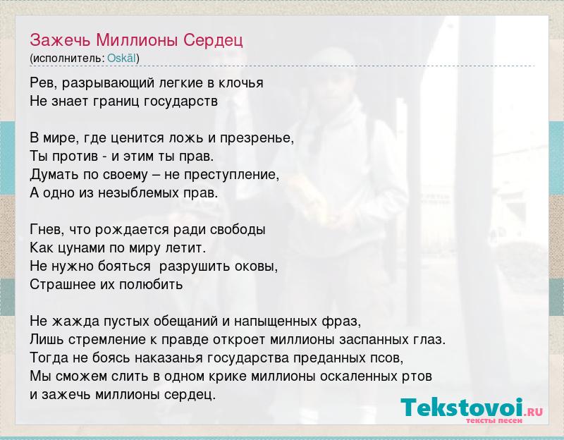 Рев, разрывающий легкие в клочья Не знает границ государств В мире, где ценится ложь и презренье, Ты против - и этим ты прав. Думать по своему – не преступление, А одно из незыблемых прав. Гнев, что рождается ради свободы Как цунами по миру летит. Не нужно бояться разрушить оковы, Страшнее их полюбить Не жажда пустых обещаний и напыщенных фраз, Лишь стремление к правде откроет миллионы заспанных глаз. Тогда не боясь наказанья государства преданных псов, Мы сможем слить в одном крике миллионы оскаленных ртов и зажечь миллионы сердец.
