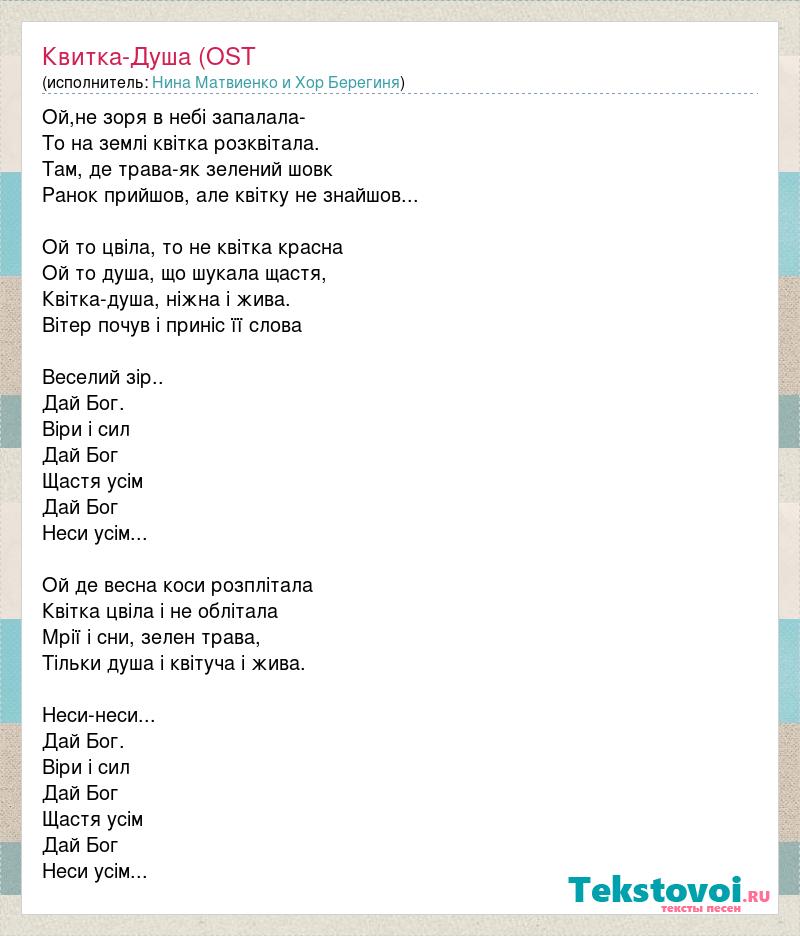 Ой,не зоря в небі запалала- То на землі квітка розквітала. Там, де трава-як зелений шовк Ранок прийшов, але квітку не знайшов... Ой то цвіла, то не квітка красна Ой то душа, що шукала щастя, Квітка-душа, ніжна і жива. Вітер почув і приніс її слова Веселий зір.. Дай Бог. Віри і сил Дай Бог Щастя усім Дай Бог Неси усім... Ой де весна коси розплітала Квітка цвіла і не облітала Мрії і сни, зелен трава, Тільки душа і квітуча і жива. Неси-неси... Дай Бог. Віри і сил Дай Бог Щастя усім Дай Бог Неси усім...