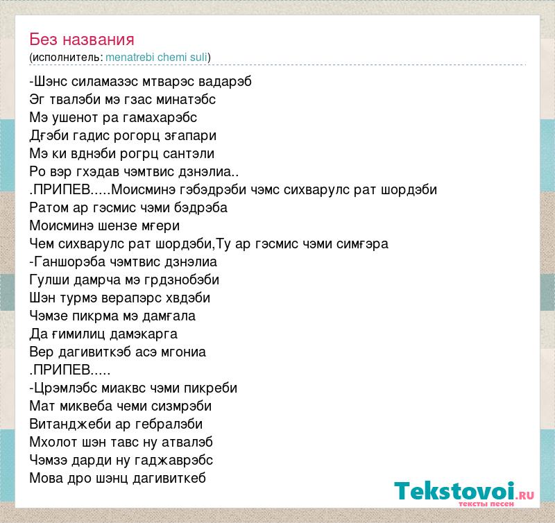 -Шэнс силамазэс мтварэс вадарэб Эг твалэби мэ гзас минатэбс Мэ ушенот ра гамахарэбс Дғэби гадис рогорц зғапари Мэ ки вднэби рогрц сантэли Ро вэр гхэдав чэмтвис дзнэлиа.. .ПРИПЕВ.....Моисминэ гэбэдрэби чэмс сихварулс рат шордэби Ратом ар гэсмис чэми бэдрэба Моисминэ шензе мғери Чем сихварулс рат шордэби,Ту ар гэсмис чэми симғэра -Ганшорэба чэмтвис дзнэлиа Гулши дамрча мэ грдзнобэби Шэн турмэ верапэрс хвдэби Чэмзе пикрма мэ дамғала Да ғимилиц дамэкарга Вер дагивиткэб асэ мгониа .ПРИПЕВ..... -Црэмлэбс миаквс чэми пикреби Мат миквеба чеми сизмрэби Витанджеби ар гебралэби Мхолот шэн тавс ну атвалэб Чэмзэ дарди ну гаджаврэбс Мова дро шэнц дагивиткеб