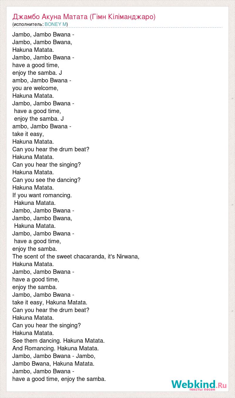 Jambo, Jambo Bwana - Jambo, Jambo Bwana, Hakuna Matata. Jambo, Jambo Bwana - have a good time, enjoy the samba. J ambo, Jambo Bwana - you are welcome, Hakuna Matata. Jambo, Jambo Bwana - have a good time, enjoy the samba. J ambo, Jambo Bwana - take it easy, Hakuna Matata. Can you hear the drum beat? Hakuna Matata. Can you hear the singing? Hakuna Matata. Can you see the dancing? Hakuna Matata. If you want romancing. Hakuna Matata. Jambo, Jambo Bwana - Jambo, Jambo Bwana, Hakuna Matata. Jambo, Jambo Bwana - have a good time, enjoy the samba. The scent of the sweet chacaranda, it's Nirwana, Hakuna Matata. Jambo, Jambo Bwana - have a good time, enjoy the samba. Jambo, Jambo Bwana - take it easy, Hakuna Matata. Can you hear the drum beat? Hakuna Matata. Can you hear the singing? Hakuna Matata. See them dancing. Hakuna Matata. And Romancing. Hakuna Matata. Jambo, Jambo Bwana - Jambo, Jambo Bwana, Hakuna Matata. Jambo, Jambo Bwana - have a good time, enjoy the samba.