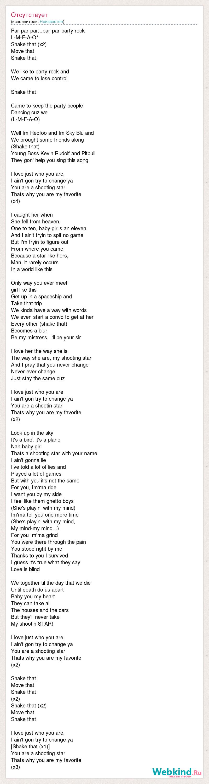 Par-par-par...par-par-party rock L-M-F-A-O* Shake that (x2) Move that Shake that We like to party rock and We came to lose control Shake that Came to keep the party people Dancing cuz we (L-M-F-A-O) Well Im Redfoo and Im Sky Blu and We brought some friends along (Shake that) Young Boss Kevin Rudolf and Pitbull They gon' help you sing this song I love just who you are, I ain't gon try to change ya You are a shooting star Thats why you are my favorite (x4) I caught her when She fell from heaven, One to ten, baby girl's an eleven And I ain't tryin to spit no game But I'm tryin to figure out From where you came Because a star like hers, Man, it rarely occurs In a world like this Only way you ever meet girl like this Get up in a spaceship and Take that trip We kinda have a way with words We even start a convo to get at her Every other (shake that) Becomes a blur Be my mistress, I'll be your sir I love her the way she is The way she are, my shooting star And I pray that you never change Never ever change Just stay the same cuz I love just who you are I ain't gon try to change ya You are a shootin star Thats why you are my favorite (x2) Look up in the sky It's a bird, it's a plane Nah baby girl Thats a shooting star with your name I ain't gonna lie I've told a lot of lies and Played a lot of games But with you it's not the same For you, Im'ma ride I want you by my side I feel like them ghetto boys (She's playin' with my mind) Im'ma tell you one more time (She's playin' with my mind, My mind-my mind...) For you Im'ma grind You were there through the pain You stood right by me Thanks to you I survived I guess it's true what they say Love is blind We together til the day that we die Until death do us apart Baby you my heart They can take all The houses and the cars But they'll never take My shootin STAR! I love just who you are, I ain't gon try to change ya You are a shooting star Thats why you are my favorite (x2) Shake that Move that Shake that (x2) Shake that (x2) Move that Shake that I love just who you are, I ain't gon try to change ya [Shake that (x1)] You are a shooting star Thats why you are my favorite (x3)