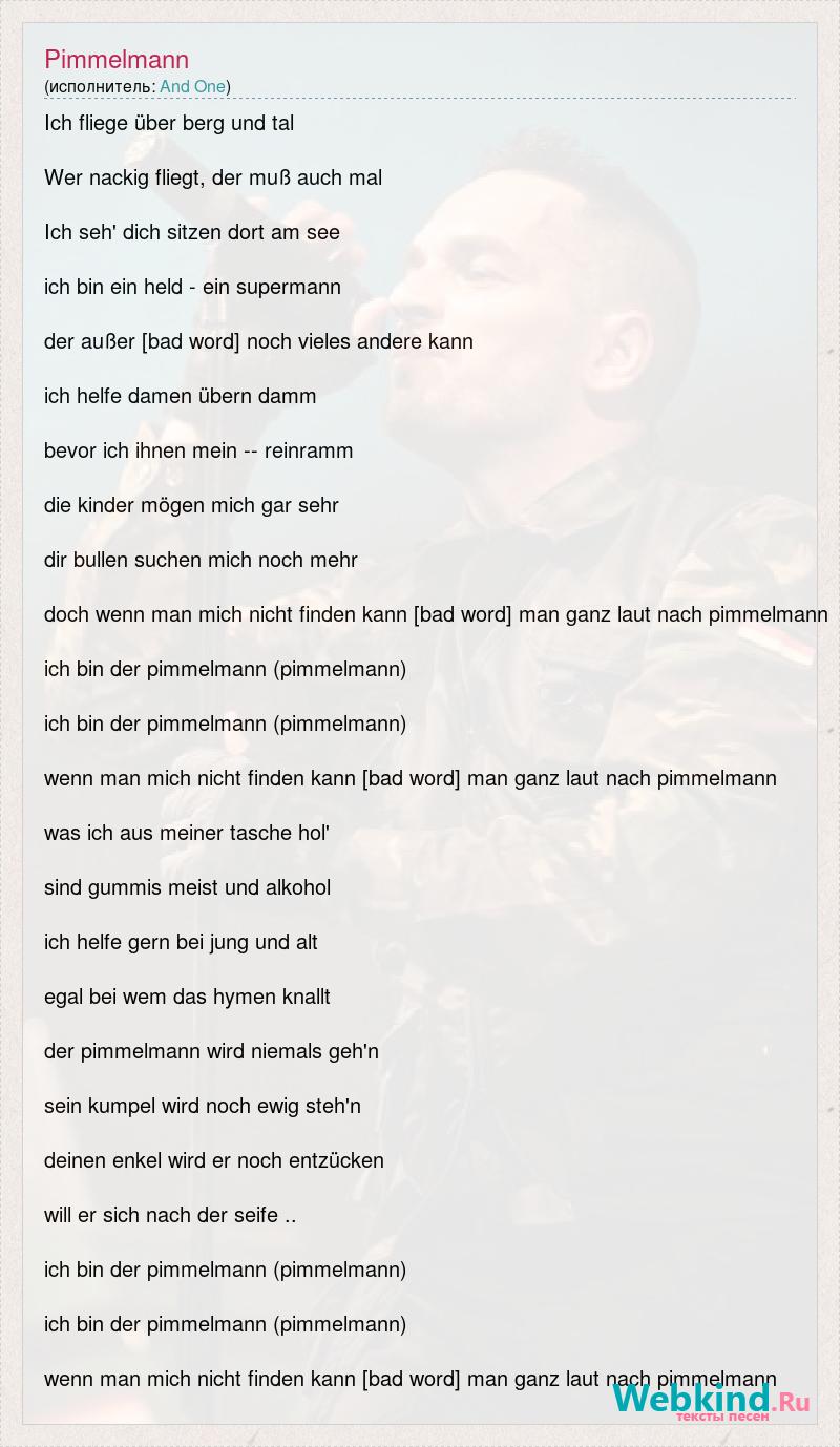 Ich fliege über berg und tal Wer nackig fliegt, der muß auch mal Ich seh' dich sitzen dort am see ich bin ein held - ein supermann der außer [bad word] noch vieles andere kann ich helfe damen übern damm bevor ich ihnen mein -- reinramm die kinder mögen mich gar sehr dir bullen suchen mich noch mehr doch wenn man mich nicht finden kann [bad word] man ganz laut nach pimmelmann ich bin der pimmelmann (pimmelmann) ich bin der pimmelmann (pimmelmann) wenn man mich nicht finden kann [bad word] man ganz laut nach pimmelmann was ich aus meiner tasche hol' sind gummis meist und alkohol ich helfe gern bei jung und alt egal bei wem das hymen knallt der pimmelmann wird niemals geh'n sein kumpel wird noch ewig steh'n deinen enkel wird er noch entzücken will er sich nach der seife .. ich bin der pimmelmann (pimmelmann) ich bin der pimmelmann (pimmelmann) wenn man mich nicht finden kann [bad word] man ganz laut nach pimmelmann