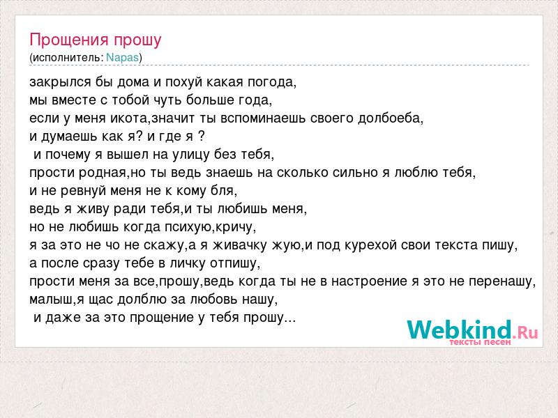 закрылся бы дома и похуй какая погода, мы вместе с тобой чуть больше года, если у меня икота,значит ты вспоминаешь своего долбоеба, и думаешь как я? и где я ? и почему я вышел на улицу без тебя, прости родная,но ты ведь знаешь на сколько сильно я люблю тебя, и не ревнуй меня не к кому бля, ведь я живу ради тебя,и ты любишь меня, но не любишь когда психую,кричу, я за это не чо не скажу,а я живачку жую,и под курехой свои текста пишу, а после сразу тебе в личку отпишу, прости меня за все,прошу,ведь когда ты не в настроение я это не перенашу, малыш,я щас долблю за любовь нашу, и даже за это прощение у тебя прошу...