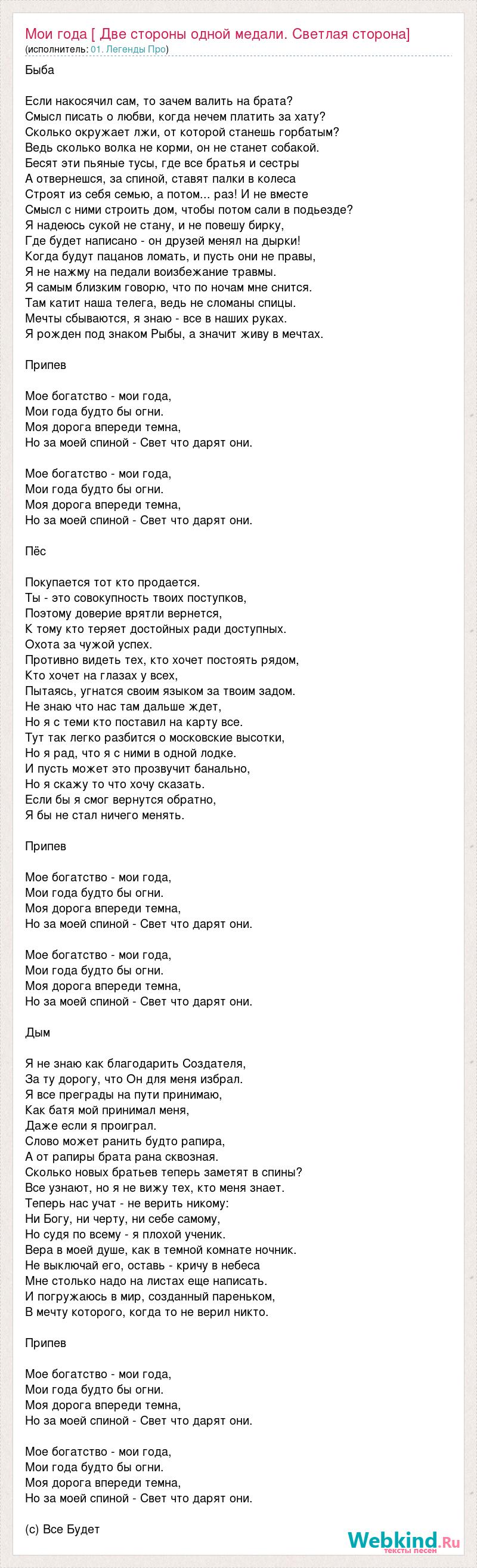 Быба Если накосячил сам, то зачем валить на брата? Смысл писать о любви, когда нечем платить за хату? Сколько окружает лжи, от которой станешь горбатым? Ведь сколько волка не корми, он не станет собакой. Бесят эти пьяные тусы, где все братья и сестры А отвернешся, за спиной, ставят палки в колеса Строят из себя семью, а потом... раз! И не вместе Смысл с ними строить дом, чтобы потом сали в подьезде? Я надеюсь сукой не стану, и не повешу бирку, Где будет написано - он друзей менял на дырки! Когда будут пацанов ломать, и пусть они не правы, Я не нажму на педали воизбежание травмы. Я самым близким говорю, что по ночам мне снится. Там катит наша телега, ведь не сломаны спицы. Мечты сбываются, я знаю - все в наших руках. Я рожден под знаком Рыбы, а значит живу в мечтах. Припев Мое богатство - мои года, Мои года будто бы огни. Моя дорога впереди темна, Но за моей спиной - Свет что дарят они. Мое богатство - мои года, Мои года будто бы огни. Моя дорога впереди темна, Но за моей спиной - Свет что дарят они. Пёс Покупается тот кто продается. Ты - это совокупность твоих поступков, Поэтому доверие врятли вернется, К тому кто теряет достойных ради доступных. Охота за чужой успех. Противно видеть тех, кто хочет постоять рядом, Кто хочет на глазах у всех, Пытаясь, угнатся своим языком за твоим задом. Не знаю что нас там дальше ждет, Но я с теми кто поставил на карту все. Тут так легко разбится о московские высотки, Но я рад, что я с ними в одной лодке. И пусть может это прозвучит банально, Но я скажу то что хочу сказать. Если бы я смог вернутся обратно, Я бы не стал ничего менять. Припев Мое богатство - мои года, Мои года будто бы огни. Моя дорога впереди темна, Но за моей спиной - Свет что дарят они. Мое богатство - мои года, Мои года будто бы огни. Моя дорога впереди темна, Но за моей спиной - Свет что дарят они. Дым Я не знаю как благодарить Создателя, За ту дорогу, что Он для меня избрал. Я все преграды на пути принимаю, Как батя мой принимал меня, Даже если я проиграл. Слово может ранить будто рапира, А от рапиры брата рана сквозная. Сколько новых братьев теперь заметят в спины? Все узнают, но я не вижу тех, кто меня знает. Теперь нас учат - не верить никому: Ни Богу, ни черту, ни себе самому, Но судя по всему - я плохой ученик. Вера в моей душе, как в темной комнате ночник. Не выключай его, оставь - кричу в небеса Мне столько надо на листах еще написать. И погружаюсь в мир, созданный пареньком, В мечту которого, когда то не верил никто. Припев Мое богатство - мои года, Мои года будто бы огни. Моя дорога впереди темна, Но за моей спиной - Свет что дарят они. Мое богатство - мои года, Мои года будто бы огни. Моя дорога впереди темна, Но за моей спиной - Свет что дарят они. (с) Все Будет