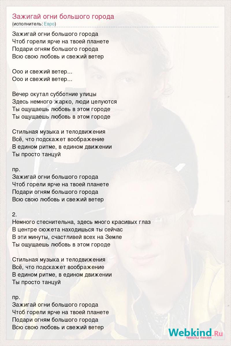 Зажигай огни большого города Чтоб горели ярче на твоей планете Подари огням большого города Всю свою любовь и свежий ветер Ооо и свежий ветер... Ооо и свежий ветер... Вечер окутал субботние улицы Здесь немного жарко, люди целуются Ты ощущаешь любовь в этом городе Ты ощущаешь любовь в этом городе Стильная музыка и телодвижения Всё, что подскажет воображение В едином ритме, в едином движении Ты просто танцуй пр. Зажигай огни большого города Чтоб горели ярче на твоей планете Подари огням большого города Всю свою любовь и свежий ветер 2. Немного стеснительна, здесь много красивых глаз В центре сюжета находишься ты сейчас В эти минуты, счастливей всех на Земле Ты ощущаешь любовь в этом городе Стильная музыка и телодвижения Всё, что подскажет воображение В едином ритме, в едином движении Ты просто танцуй пр. Зажигай огни большого города Чтоб горели ярче на твоей планете Подари огням большого города Всю свою любовь и свежий ветер