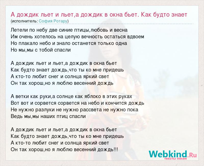 Летели по небу две синие птицы,любовь и весна Им очень хотелось на целую вечность остаться вдвоем Но плакало небо и знало останется только одна Но мы,мы с тобой спасли А дождик льет и льет,а дождик в окна бьет Как будто знает дождь,что ты ко мне придешь А кто-то любит снег и солнца яркий свет Он так хорош,но я люблю весенний дождь А ветки как руки,а солнце как яблоко в этих руках Вот вот и сорвется сорвется на небо и кончится дождь Не нужно разлуки не нужно рассвета не нужно пока Ведь мы,мы наших птиц спасли А дождик льет и льет,а дождик в окна бьет Как будто знает дождь,что ты ко мне придешь А кто-то любит снег и солнца яркий свет Он так хорош,но я люблю весенний дождь!!!