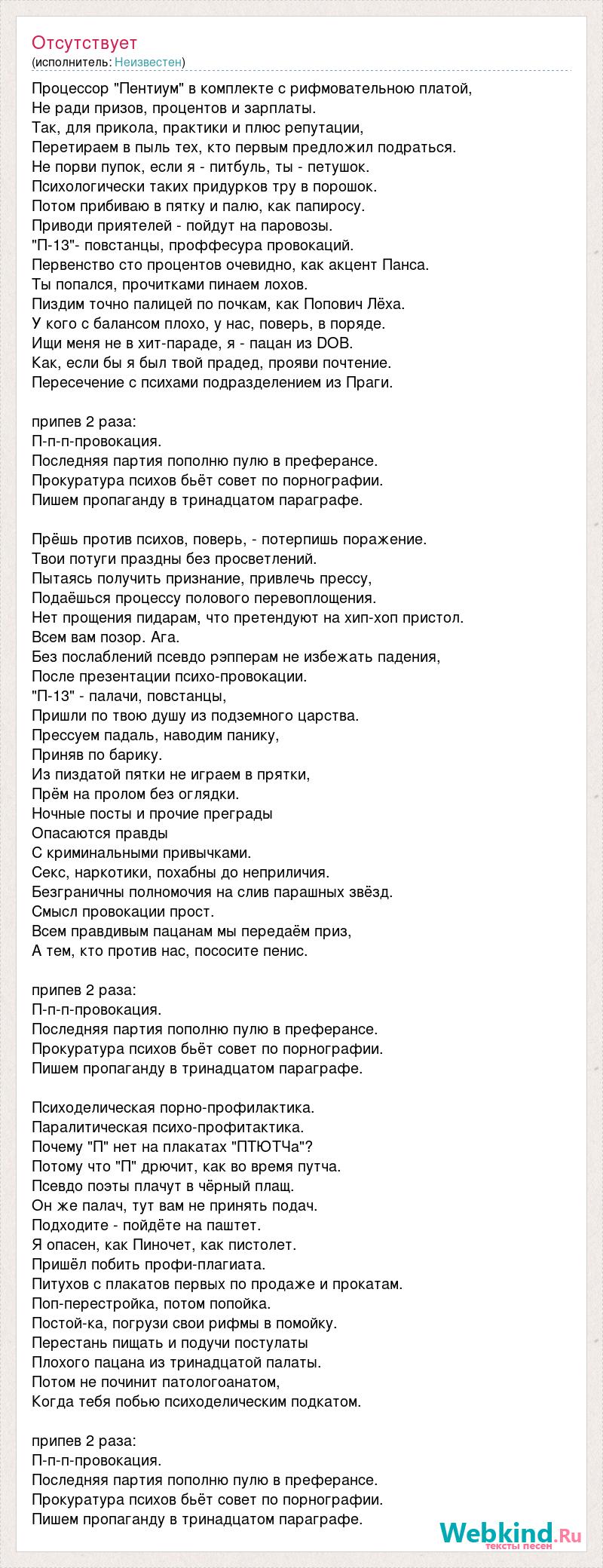 Процессор "Пентиум" в комплекте с рифмовательною платой, Не ради призов, процентов и зарплаты. Так, для прикола, практики и плюс репутации, Перетираем в пыль тех, кто первым предложил подраться. Не порви пупок, если я - питбуль, ты - петушок. Психологически таких придурков тру в порошок. Потом прибиваю в пятку и палю, как папиросу. Приводи приятелей - пойдут на паровозы. "П-13"- повстанцы, проффесура провокаций. Первенство сто процентов очевидно, как акцент Панса. Ты попался, прочитками пинаем лохов. Пиздим точно палицей по почкам, как Попович Лёха. У кого с балансом плохо, у нас, поверь, в поряде. Ищи меня не в хит-параде, я - пацан из DOB. Как, если бы я был твой прадед, прояви почтение. Пересечение с психами подразделением из Праги. припев 2 раза: П-п-п-провокация. Последняя партия пополню пулю в преферансе. Прокуратура психов бьёт совет по порнографии. Пишем пропаганду в тринадцатом параграфе. Прёшь против психов, поверь, - потерпишь поражение. Твои потуги праздны без просветлений. Пытаясь получить признание, привлечь прессу, Подаёшься процессу полового перевоплощения. Нет прощения пидарам, что претендуют на хип-хоп пристол. Всем вам позор. Ага. Без послаблений псевдо рэпперам не избежать падения, После презентации психо-провокации. "П-13" - палачи, повстанцы, Пришли по твою душу из подземного царства. Прессуем падаль, наводим панику, Приняв по барику. Из пиздатой пятки не играем в прятки, Прём на пролом без оглядки. Ночные посты и прочие преграды Опасаются правды С криминальными привычками. Секс, наркотики, похабны до неприличия. Безграничны полномочия на слив парашных звёзд. Смысл провокации прост. Всем правдивым пацанам мы передаём приз, А тем, кто против нас, пососите пенис. припев 2 раза: П-п-п-провокация. Последняя партия пополню пулю в преферансе. Прокуратура психов бьёт совет по порнографии. Пишем пропаганду в тринадцатом параграфе. Психоделическая порно-профилактика. Паралитическая психо-профитактика. Почему "П" нет на плакатах "ПТЮТЧа"? Потому что "П" дрючит, как во время путча. Псевдо поэты плачут в чёрный плащ. Он же палач, тут вам не принять подач. Подходите - пойдёте на паштет. Я опасен, как Пиночет, как пистолет. Пришёл побить профи-плагиата. Питухов с плакатов первых по продаже и прокатам. Поп-перестройка, потом попойка. Постой-ка, погрузи свои рифмы в помойку. Перестань пищать и подучи постулаты Плохого пацана из тринадцатой палаты. Потом не починит патологоанатом, Когда тебя побью психоделическим подкатом. припев 2 раза: П-п-п-провокация. Последняя партия пополню пулю в преферансе. Прокуратура психов бьёт совет по порнографии. Пишем пропаганду в тринадцатом параграфе.