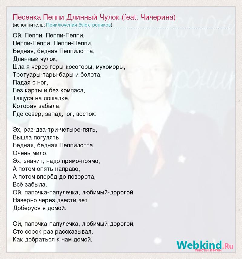 Ой, Пеппи, Пеппи-Пеппи, Пеппи-Пеппи, Пеппи-Пеппи, Бедная, бедная Пеппилотта, Длинный чулок, Шла я через горы-косогоры, мухоморы, Тротуары-тары-бары и болота, Падая с ног, Без карты и без компаса, Тащуся на лошадке, Которая забыла, Где север, запад, юг, восток. Эх, раз-два-три-четыре-пять, Вышла погулять Бедная, бедная Пеппилотта, Очень мило. Эх, значит, надо прямо-прямо, А потом опять направо, А потом вперёд до поворота, Всё забыла. Ой, папочка-папулечка, любимый-дорогой, Наверно через двести лет Доберуся я домой. Ой, папочка-папулечка, любимый-дорогой, Сто сорок раз рассказывал, Как добраться к нам домой.