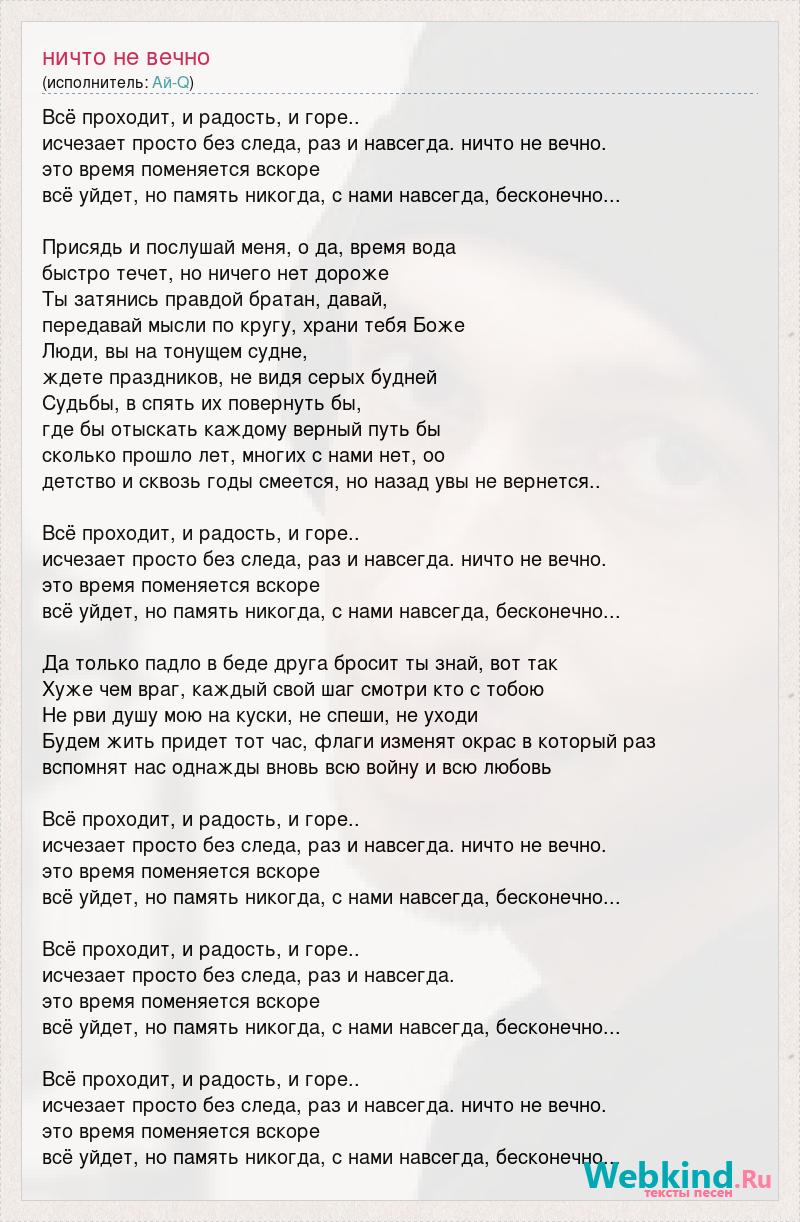Всё проходит, и радость, и горе.. исчезает просто без следа, раз и навсегда. ничто не вечно. это время поменяется вскоре всё уйдет, но память никогда, с нами навсегда, бесконечно... Присядь и послушай меня, о да, время вода быстро течет, но ничего нет дороже Ты затянись правдой братан, давай, передавай мысли по кругу, храни тебя Боже Люди, вы на тонущем судне, ждете праздников, не видя серых будней Судьбы, в спять их повернуть бы, где бы отыскать каждому верный путь бы сколько прошло лет, многих с нами нет, оо детство и сквозь годы смеется, но назад увы не вернется.. Всё проходит, и радость, и горе.. исчезает просто без следа, раз и навсегда. ничто не вечно. это время поменяется вскоре всё уйдет, но память никогда, с нами навсегда, бесконечно... Да только падло в беде друга бросит ты знай, вот так Хуже чем враг, каждый свой шаг смотри кто с тобою Не рви душу мою на куски, не спеши, не уходи Будем жить придет тот час, флаги изменят окрас в который раз вспомнят нас однажды вновь всю войну и всю любовь Всё проходит, и радость, и горе.. исчезает просто без следа, раз и навсегда. ничто не вечно. это время поменяется вскоре всё уйдет, но память никогда, с нами навсегда, бесконечно... Всё проходит, и радость, и горе.. исчезает просто без следа, раз и навсегда. это время поменяется вскоре всё уйдет, но память никогда, с нами навсегда, бесконечно... Всё проходит, и радость, и горе.. исчезает просто без следа, раз и навсегда. ничто не вечно. это время поменяется вскоре всё уйдет, но память никогда, с нами навсегда, бесконечно...