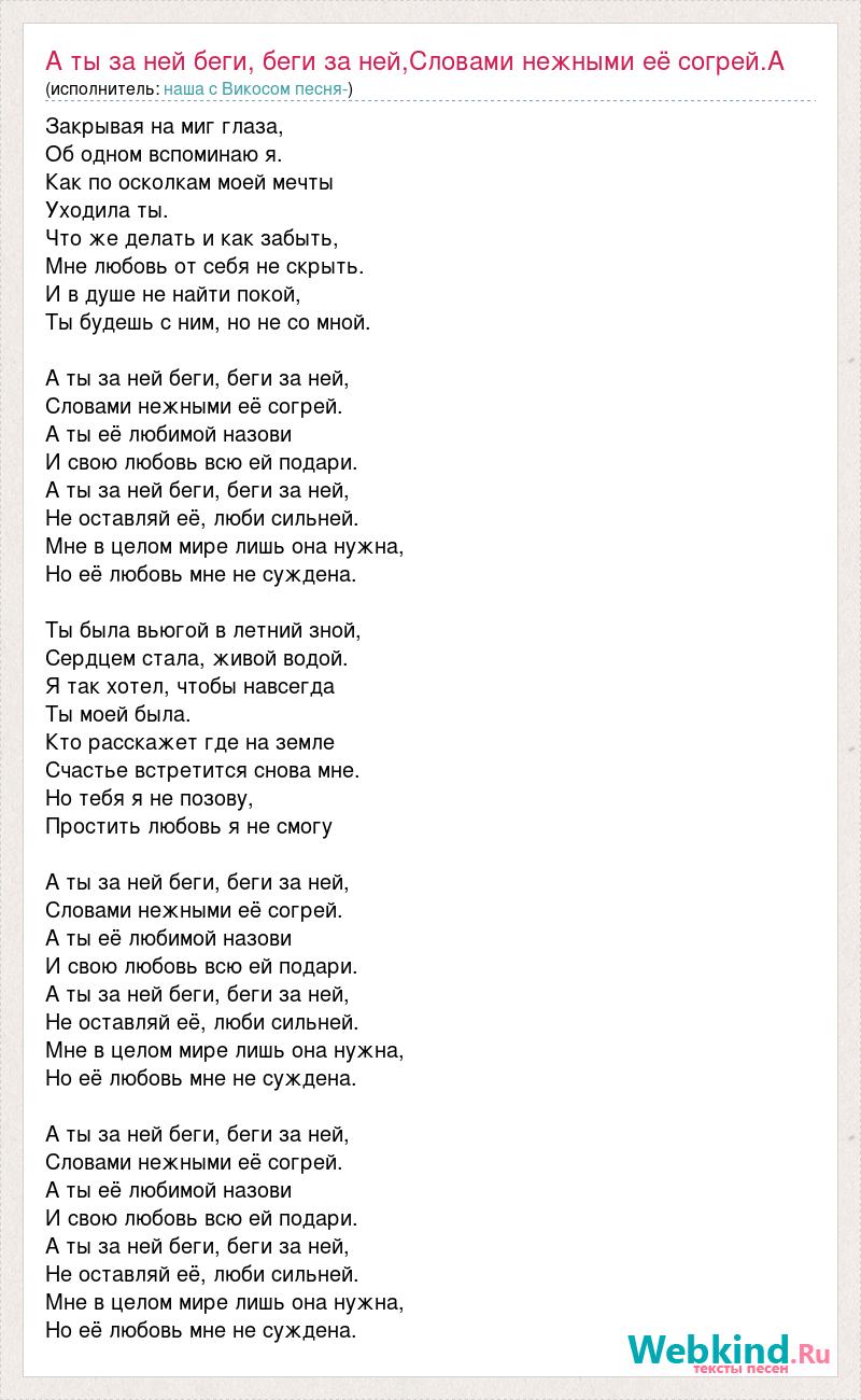 Главная→Исполнители→Наша с Викосом песня-→А ты за ней беги, беги за ней,Словами нежными её согрей.А ты её любимой назови,И