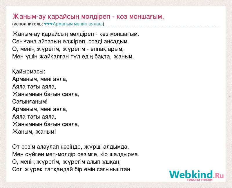 Жаным-ау қарайсың мөлдіреп - көз моншағым. Сен ғана айтатын елжіреп, сөзді аңсадым. О, менің жүрегім, жүрегім - әппақ арым, Мен үшін жайқалған гүл едің бақта, жаным. Қайырмасы: Арманым, мені аяла, Аяла тағы аяла, Жанымның бағын саяла, Сағынғаным! Арманым, мені аяла, Аяла тағы аяла, Жанымның бағын саяла, Жаным, жаным! От сезім алаулап көзіңде, жүрші алдымда. Мен сүйген мөп-молдір сезімге, кір шалдырма. О, менің жүрегім, жүрегім алып ұшқан, Сол жүрек тапқандай бір емін сағыныштан.