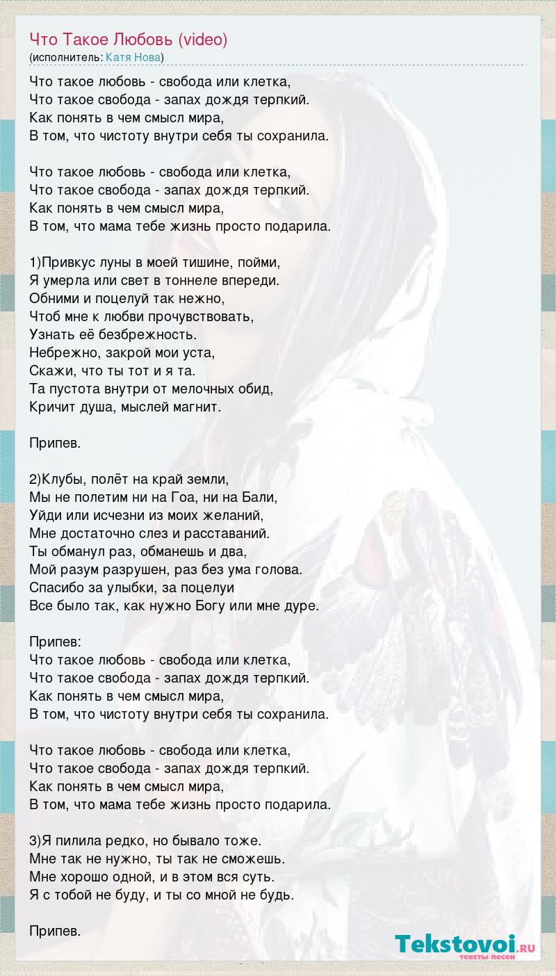 Что такое любовь - свобода или клетка, Что такое свобода - запах дождя терпкий. Как понять в чем смысл мира, В том, что чистоту внутри себя ты сохранила. Что такое любовь - свобода или клетка, Что такое свобода - запах дождя терпкий. Как понять в чем смысл мира, В том, что мама тебе жизнь просто подарила. 1)Привкус луны в моей тишине, пойми, Я умерла или свет в тоннеле впереди. Обними и поцелуй так нежно, Чтоб мне к любви прочувствовать, Узнать её безбрежность. Небрежно, закрой мои уста, Скажи, что ты тот и я та. Та пустота внутри от мелочных обид, Кричит душа, мыслей магнит. Припев. 2)Клубы, полёт на край земли, Мы не полетим ни на Гоа, ни на Бали, Уйди или исчезни из моих желаний, Мне достаточно слез и расставаний. Ты обманул раз, обманешь и два, Мой разум разрушен, раз без ума голова. Спасибо за улыбки, за поцелуи Все было так, как нужно Богу или мне дуре. Припев: Что такое любовь - свобода или клетка, Что такое свобода - запах дождя терпкий. Как понять в чем смысл мира, В том, что чистоту внутри себя ты сохранила. Что такое любовь - свобода или клетка, Что такое свобода - запах дождя терпкий. Как понять в чем смысл мира, В том, что мама тебе жизнь просто подарила. 3)Я пилила редко, но бывало тоже. Мне так не нужно, ты так не сможешь. Мне хорошо одной, и в этом вся суть. Я с тобой не буду, и ты со мной не будь. Припев.