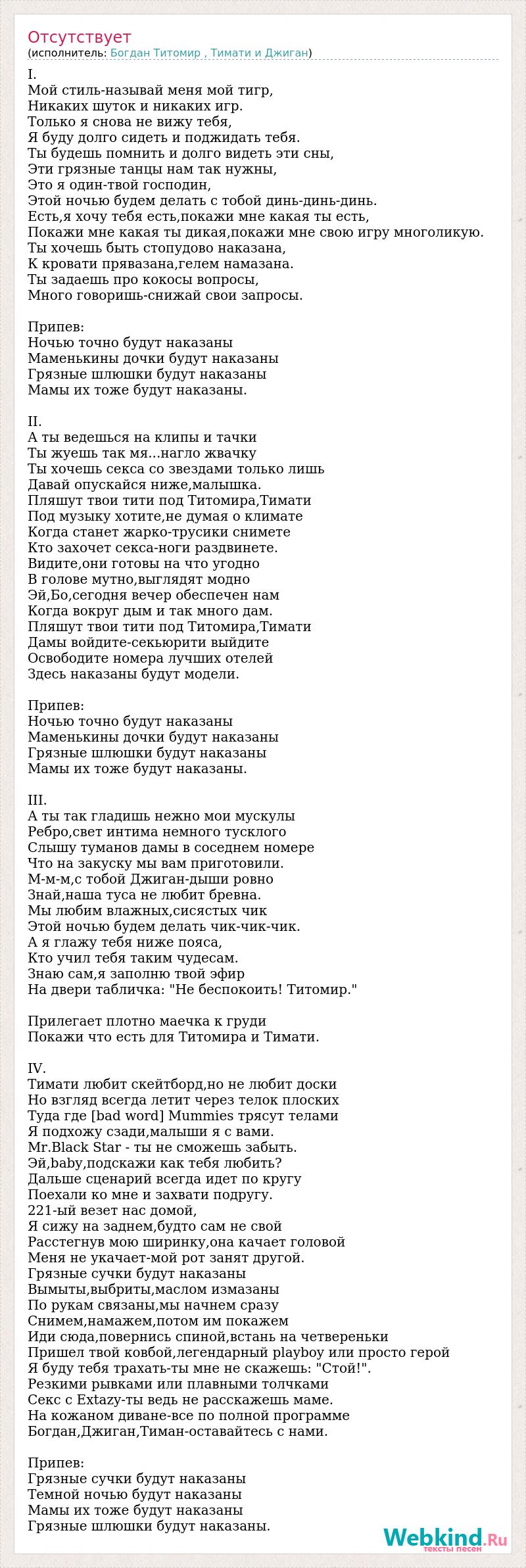 I. Мой стиль-называй меня мой тигр, Никаких шуток и никаких игр. Только я снова не вижу тебя, Я буду долго сидеть и поджидать тебя. Ты будешь помнить и долго видеть эти сны, Эти грязные танцы нам так нужны, Это я один-твой господин, Этой ночью будем делать с тобой динь-динь-динь. Есть,я хочу тебя есть,покажи мне какая ты есть, Покажи мне какая ты дикая,покажи мне свою игру многоликую. Ты хочешь быть стопудово наказана, К кровати прявазана,гелем намазана. Ты задаешь про кокосы вопросы, Много говоришь-снижай свои запросы. Припев: Ночью точно будут наказаны Маменькины дочки будут наказаны Грязные шлюшки будут наказаны Мамы их тоже будут наказаны. II. А ты ведешься на клипы и тачки Ты жуешь так мя...нагло жвачку Ты хочешь секса со звездами только лишь Давай опускайся ниже,малышка. Пляшут твои тити под Титомира,Тимати Под музыку хотите,не думая о климате Когда станет жарко-трусики снимете Кто захочет секса-ноги раздвинете. Видите,они готовы на что угодно В голове мутно,выглядят модно Эй,Бо,сегодня вечер обеспечен нам Когда вокруг дым и так много дам. Пляшут твои тити под Титомира,Тимати Дамы войдите-секьюрити выйдите Освободите номера лучших отелей Здесь наказаны будут модели. Припев: Ночью точно будут наказаны Маменькины дочки будут наказаны Грязные шлюшки будут наказаны Мамы их тоже будут наказаны. III. А ты так гладишь нежно мои мускулы Ребро,свет интима немного тусклого Слышу туманов дамы в соседнем номере Что на закуску мы вам приготовили. М-м-м,с тобой Джиган-дыши ровно Знай,наша туса не любит бревна. Мы любим влажных,сисястых чик Этой ночью будем делать чик-чик-чик. А я глажу тебя ниже пояса, Кто учил тебя таким чудесам. Знаю сам,я заполню твой эфир На двери табличка: "Не беспокоить! Титомир." Прилегает плотно маечка к груди Покажи что есть для Титомира и Тимати. IV. Тимати любит скейтборд,но не любит доски Но взгляд всегда летит через телок плоских Туда где [bad word] Mummies трясут телами Я подхожу сзади,малыши я с вами. Mr.Black Star - ты не сможешь забыть. Эй,baby,подскажи как тебя любить? Дальше сценарий всегда идет по кругу Поехали ко мне и захвати подругу. 221-ый везет нас домой, Я сижу на заднем,будто сам не свой Расстегнув мою ширинку,она качает головой Меня не укачает-мой рот занят другой. Грязные сучки будут наказаны Вымыты,выбриты,маслом измазаны По рукам связаны,мы начнем сразу Снимем,намажем,потом им покажем Иди сюда,повернись спиной,встань на четвереньки Пришел твой ковбой,легендарный playboy или просто герой Я буду тебя трахать-ты мне не скажешь: "Стой!". Резкими рывками или плавными толчками Секс с Extazy-ты ведь не расскажешь маме. На кожаном диване-все по полной программе Богдан,Джиган,Тиман-оставайтесь с нами. Припев: Грязные сучки будут наказаны Темной ночью будут наказаны Мамы их тоже будут наказаны Грязные шлюшки будут наказаны.
