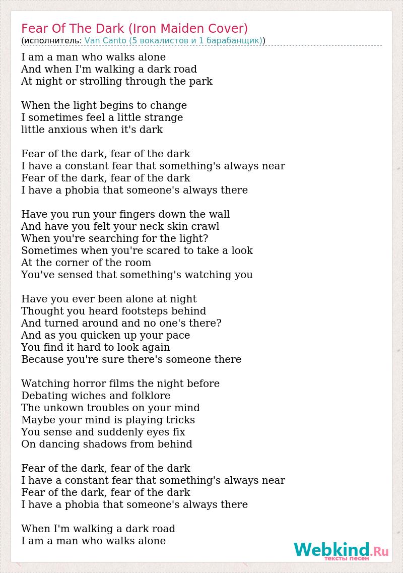 I am a man who walks alone And when I'm walking a dark road At night or strolling through the park When the light begins to change I sometimes feel a little strange little anxious when it's dark Fear of the dark, fear of the dark I have a constant fear that something's always near Fear of the dark, fear of the dark I have a phobia that someone's always there Have you run your fingers down the wall And have you felt your neck skin crawl When you're searching for the light? Sometimes when you're scared to take a look At the corner of the room You've sensed that something's watching you Have you ever been alone at night Thought you heard footsteps behind And turned around and no one's there? And as you quicken up your pace You find it hard to look again Because you're sure there's someone there Watching horror films the night before Debating wiches and folklore The unkown troubles on your mind Maybe your mind is playing tricks You sense and suddenly eyes fix On dancing shadows from behind Fear of the dark, fear of the dark I have a constant fear that something's always near Fear of the dark, fear of the dark I have a phobia that someone's always there When I'm walking a dark road I am a man who walks alone