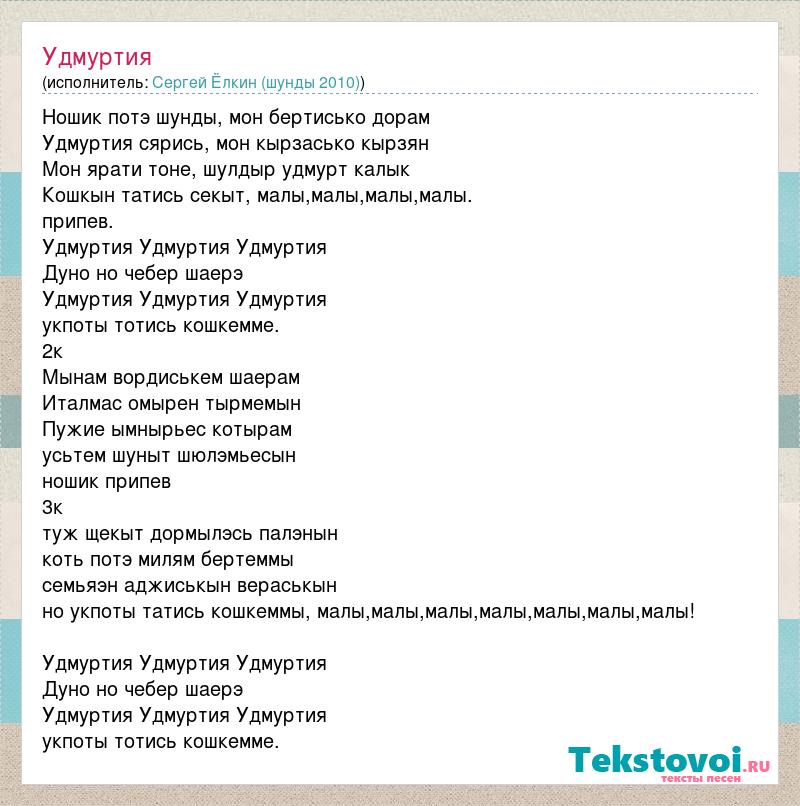 Ношик потэ шунды, мон бертисько дорам Удмуртия сярись, мон кырзасько кырзян Мон ярати тоне, шулдыр удмурт калык Кошкын татись секыт, малы,малы,малы,малы. припев. Удмуртия Удмуртия Удмуртия Дуно но чебер шаерэ Удмуртия Удмуртия Удмуртия укпоты тотись кошкемме. 2к Мынам вордиськем шаерам Италмас омырен тырмемын Пужие ымнырьес котырам усьтем шуныт шюлэмьесын ношик припев 3к туж щекыт дормылэсь палэнын коть потэ милям бертеммы семьяэн аджиськын вераськын но укпоты татись кошкеммы, малы,малы,малы,малы,малы,малы,малы! Удмуртия Удмуртия Удмуртия Дуно но чебер шаерэ Удмуртия Удмуртия Удмуртия укпоты тотись кошкемме.