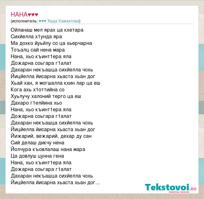 Ойланаш мел ярах ца кхетара Сихйелла х1унда яра Ма дохко йуьйлу со ца хьерчарна Тоъалц сай нена мара Нана, хьо къинт1ера яла Дожарна соьгара г1алат Дахаран некъашца сихйелла чохь Йицйелла йисарна хьаста хьан дог Хьай хан, я могшалла кхин лар ца еш Кога ахь х1оттийна со Хуьлучу халоний терго ца еш Дахаро г1елйина хьо Нана, хьо къинт1ера яла Дожарна соьгара г1алат Дахаран некъашца сихйелла чохь Йицйелла йисарна хьаста хьан дог Йижарий, вежарий, дехар ду сан Сий делаш дикчу нена Йолчура къовлалаш нана мара Ца довлуш цунна гена Нана, хьо къинт1ера яла Дожарна соьгара г1алат Дахаран некъашца сихйелла чохь Йицйелла йисарна хьаста хьан дог...