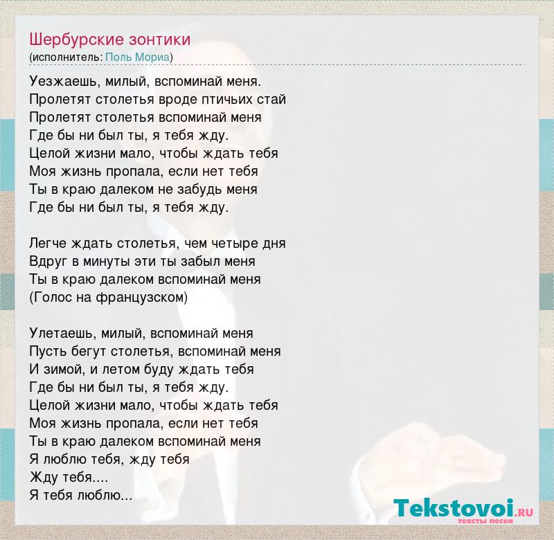 Уезжаешь, милый, вспоминай меня. Пролетят столетья вроде птичьих стай Пролетят столетья вспоминай меня Где бы ни был ты, я тебя жду. Целой жизни мало, чтобы ждать тебя Моя жизнь пропала, если нет тебя Ты в краю далеком не забудь меня Где бы ни был ты, я тебя жду. Легче ждать столетья, чем четыре дня Вдруг в минуты эти ты забыл меня Ты в краю далеком вспоминай меня (Голос на французском) Улетаешь, милый, вспоминай меня Пусть бегут столетья, вспоминай меня И зимой, и летом буду ждать тебя Где бы ни был ты, я тебя жду. Целой жизни мало, чтобы ждать тебя Моя жизнь пропала, если нет тебя Ты в краю далеком вспоминай меня Я люблю тебя, жду тебя Жду тебя.... Я тебя люблю...
